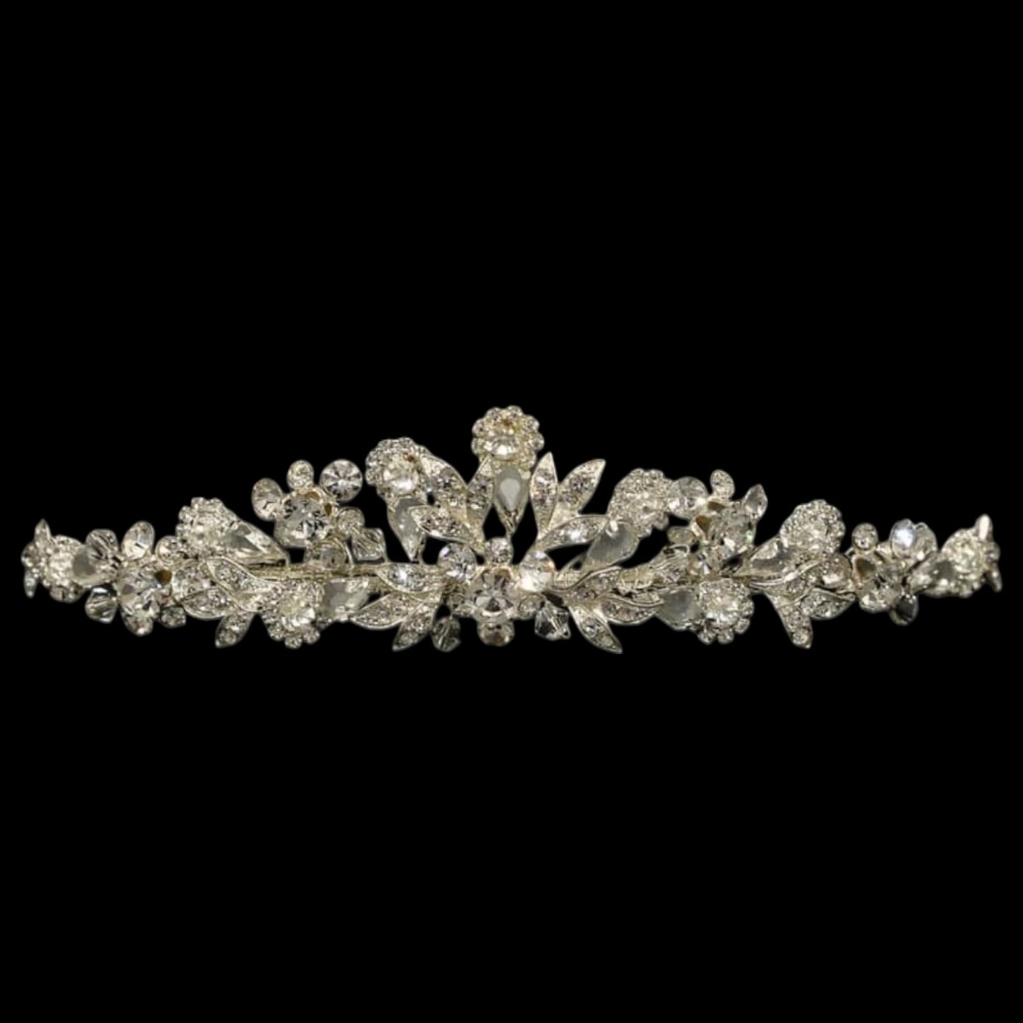 Complete your bridal look with this elegant crystal floral vine bridal tiara, a beautifully designed wedding hair accessory that adds sparkle and romance to your wedding day hairstyle. Featuring delicate crystal flowers, shimmering leaf detailing and an intricate vine design, this stunning bridal tiara catches the light from every angle for a timeless bridal finish.
