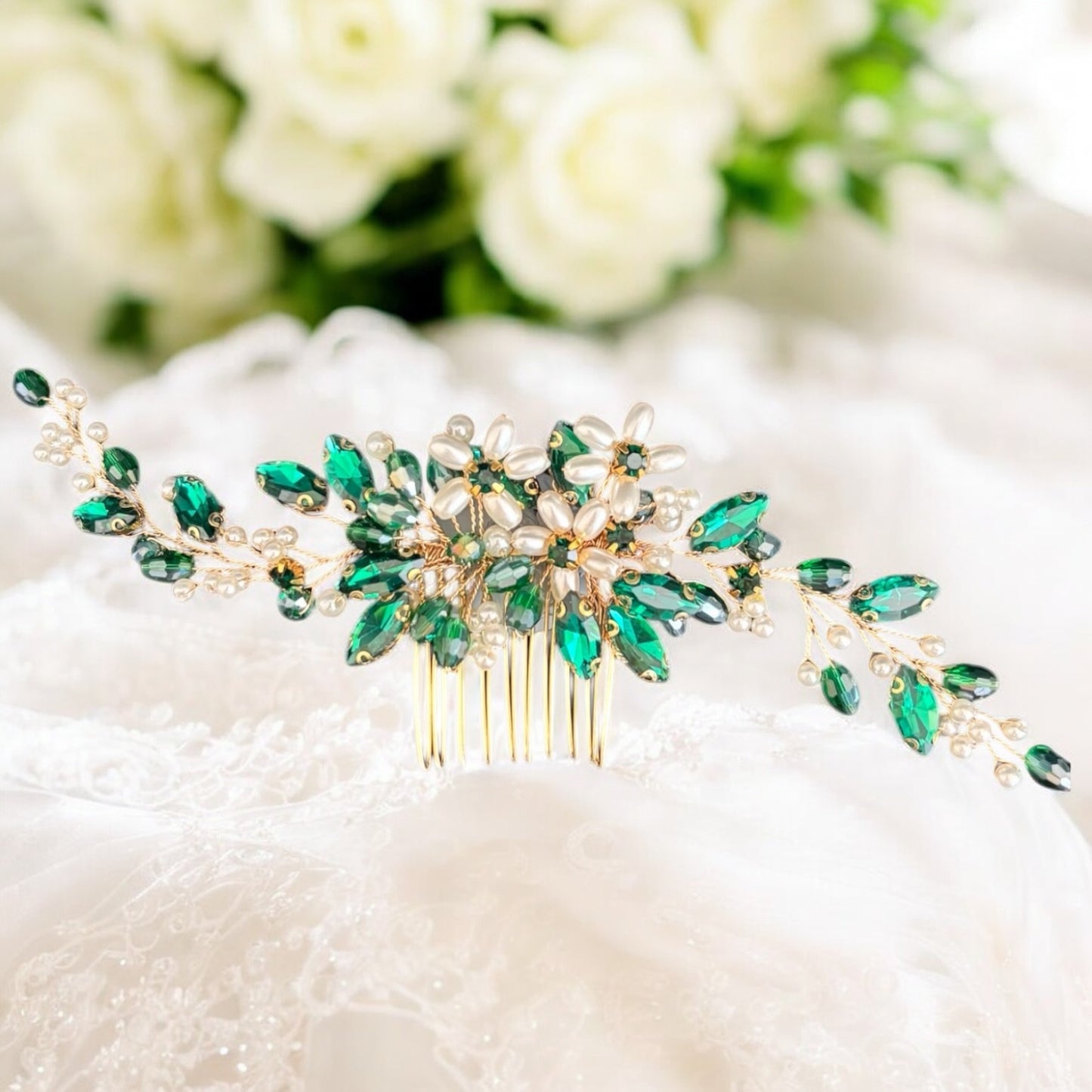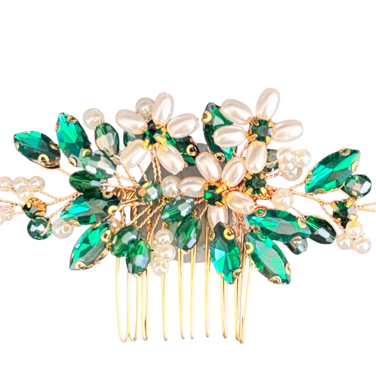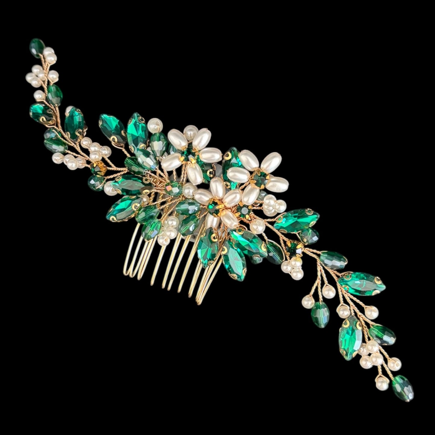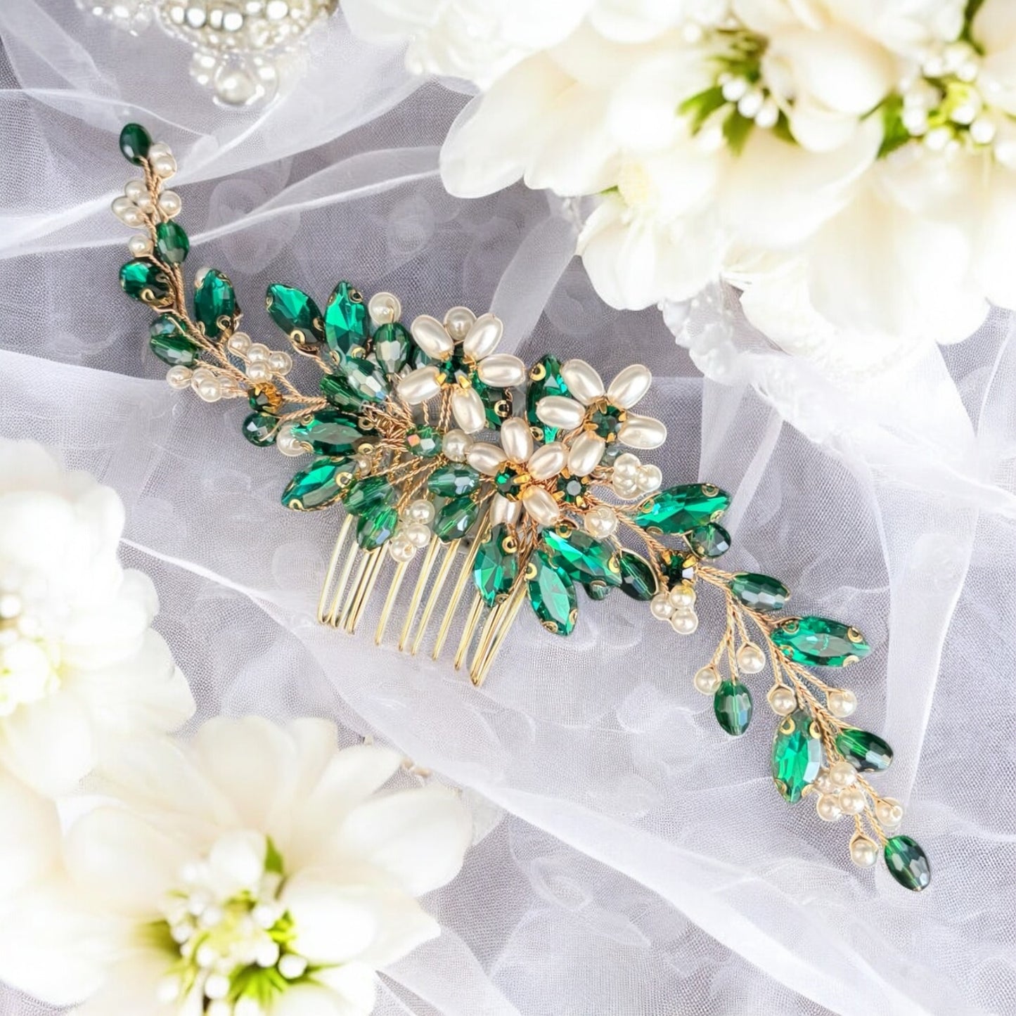 This exquisite gold bridal hair comb is a stunning accessory adorned with radiant emerald green crystals and delicate ivory pearls, thoughtfully designed to enhance your wedding ensemble with elegance. Its intricate floral motif effortlessly captures and reflects light, creating a soft, captivating shimmer that adds understated glamour from every angle.