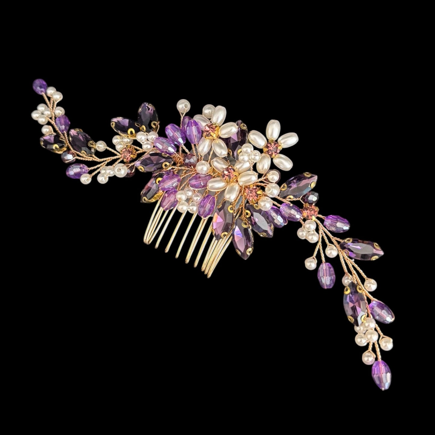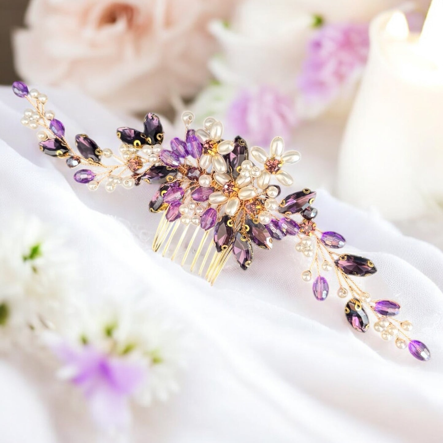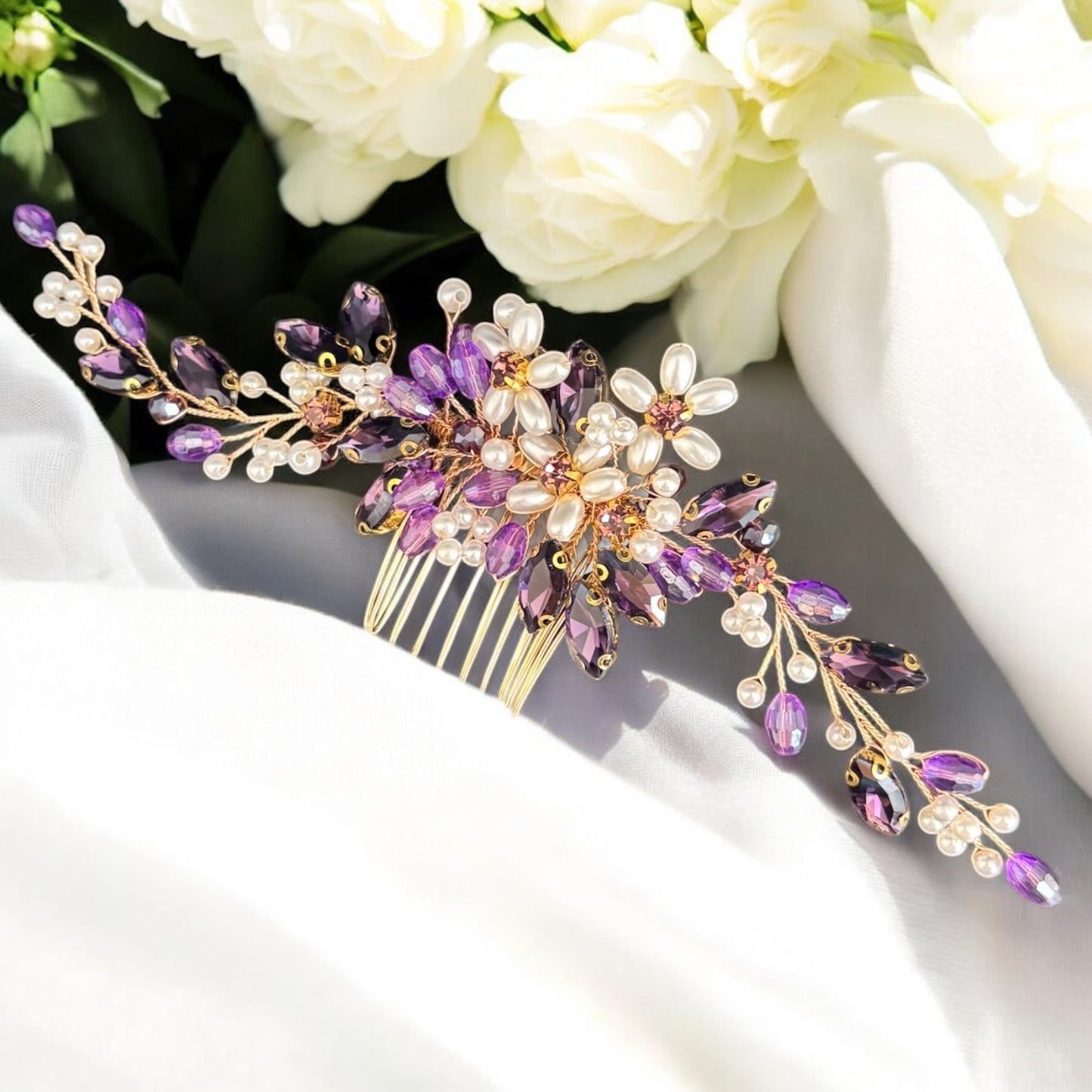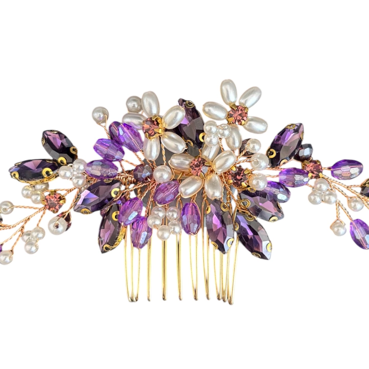 This elegant gold bridal hair comb features purple crystals paired with soft ivory pearls, crafted to accentuate your bridal look. Its intricate floral design catches light with a captivating shimmer, adding subtle sparkle from every angle.