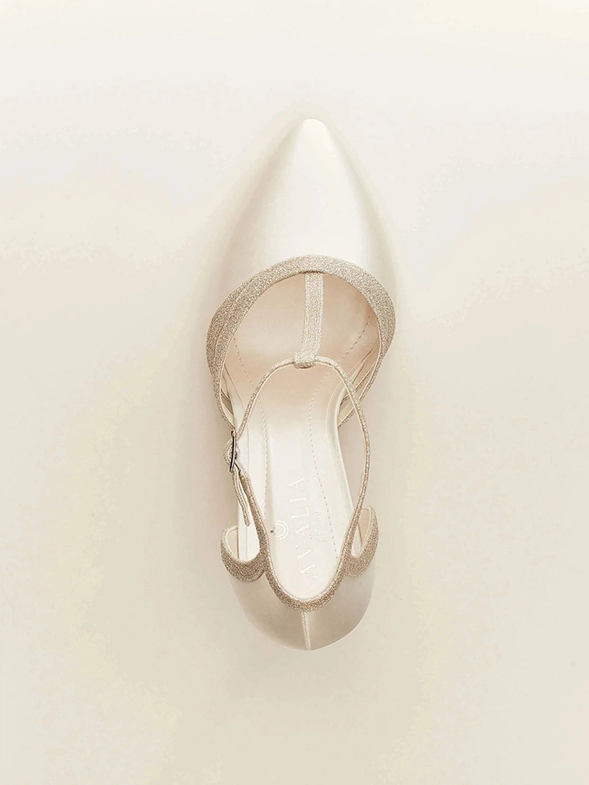 Wilma is an outstanding bridal shoe made of high quality satin with silver glitter T Bar and straps. With a closed toe and heel, Wilma is open in the middle and closes together with a glitter t-strap, resulting in a classic but glamourous look.