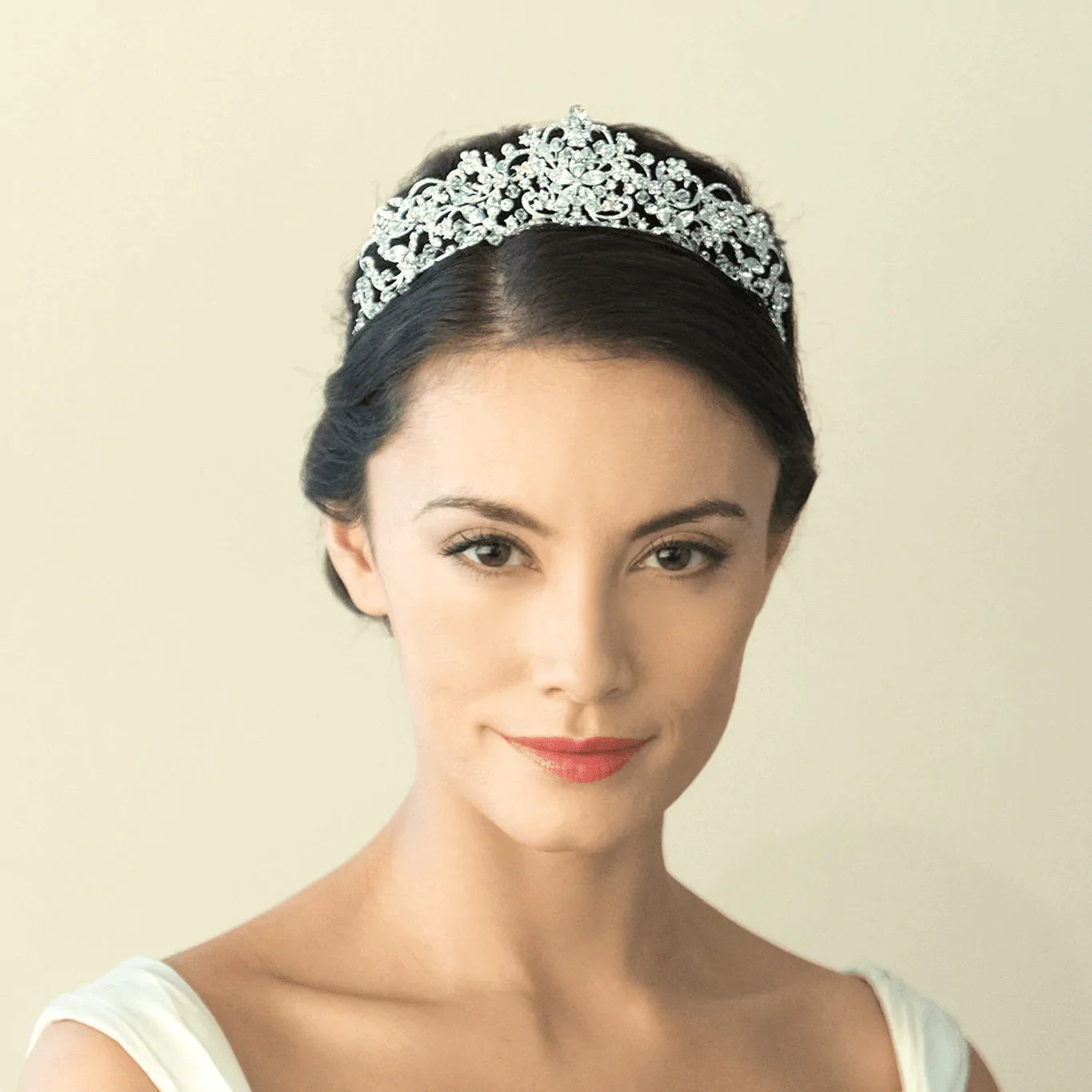A very glamorous bridal tiara inspired by Victorian opulence. This beautiful brides headdress has been designed in a floral pattern and set with sparkling marquise and solitaire cut crystals. A stunning traditional tiara which would complement a classic style wedding gown with royal influences.