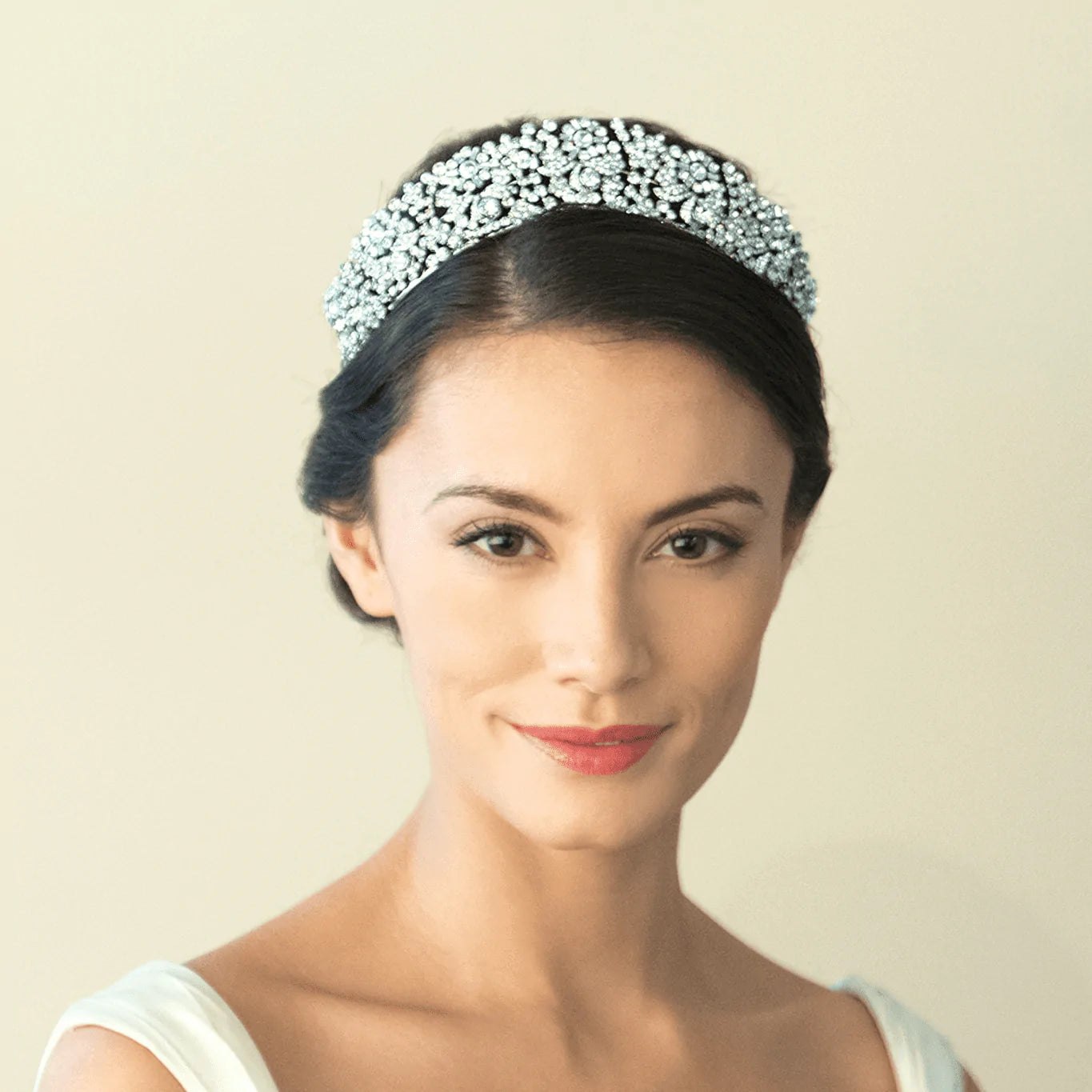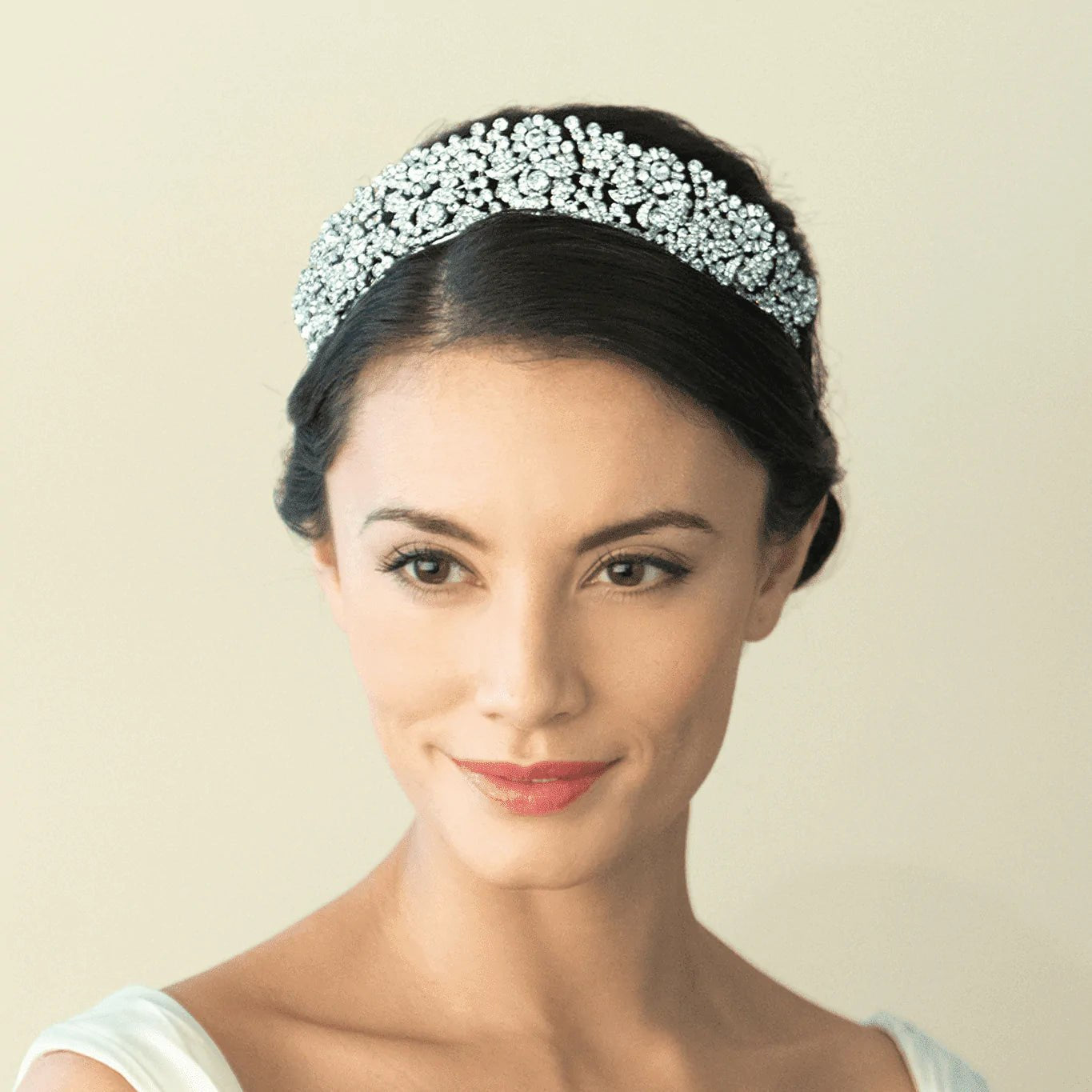 Queen Anne Crystal Wedding Tiara, as the name suggests certainly is a real statement headpiece, influenced by royalty to give a truly spectacular effect. This beautiful bridal tiara has been created using sparkling cut solitaire crystals and baguettes to form a floral leaf design. A perfect tiara to suit brides wanting formal and impressive styling to complement their wedding gown.