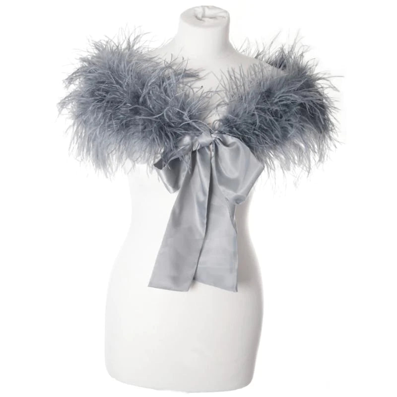 A luxurious grey vintage inspired genuine feather bridal stole. High quality Glamorous and stylish through and through. This lovely bridal stole has a Silver / grey satin ribbon attached.
