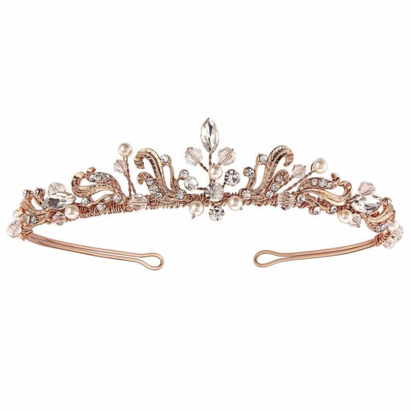 Brides or Bridesmaids Clarabelle Rose Gold Tiara, Clear Crystals, Ivory Pearls 1120