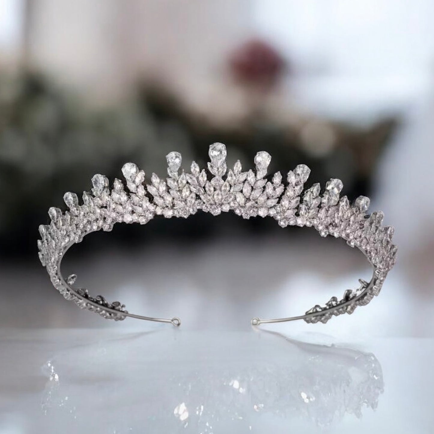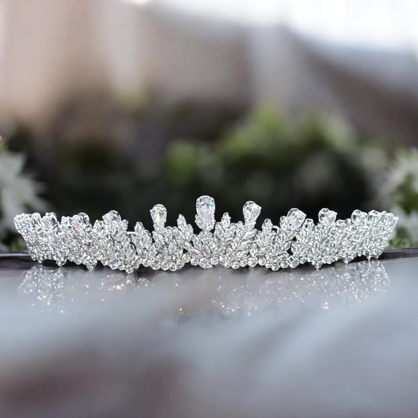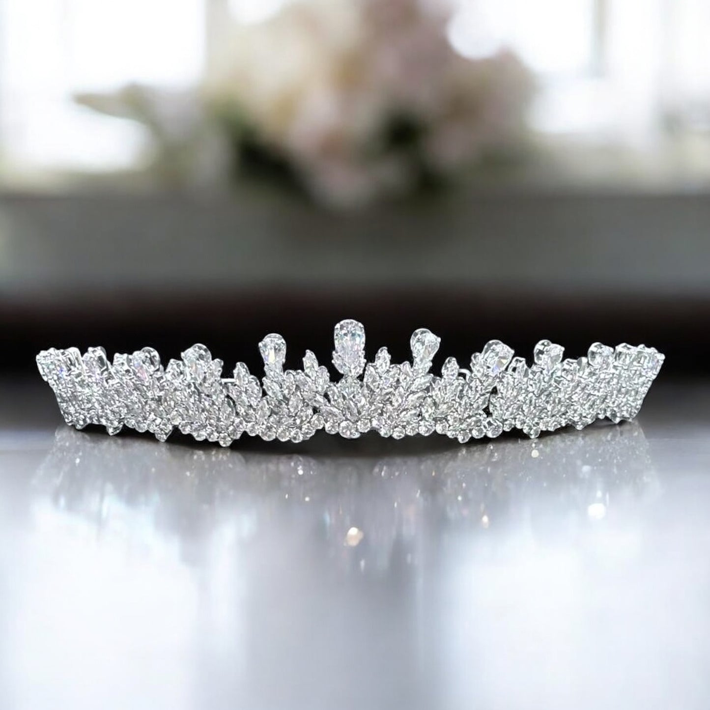 Complete your bridal look with this beautiful Crystal Bridal Tiara, a handcrafted piece featuring shimmering marquise-cut crystals in a graceful peak design. This elegant wedding crown adds timeless sparkle and sophistication to any hairstyle – from flowing waves to a polished updo.