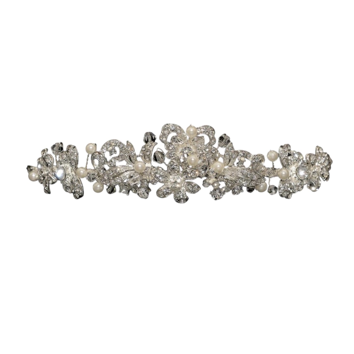 This exquisite bridal tiara is a timeless blend of elegance and sparkle, designed for brides who love classic romance with a refined finish. Crafted in a delicate silver-tone setting, the tiara features an intricate floral and vine design adorned with shimmering crystals and luminous pearl accents.