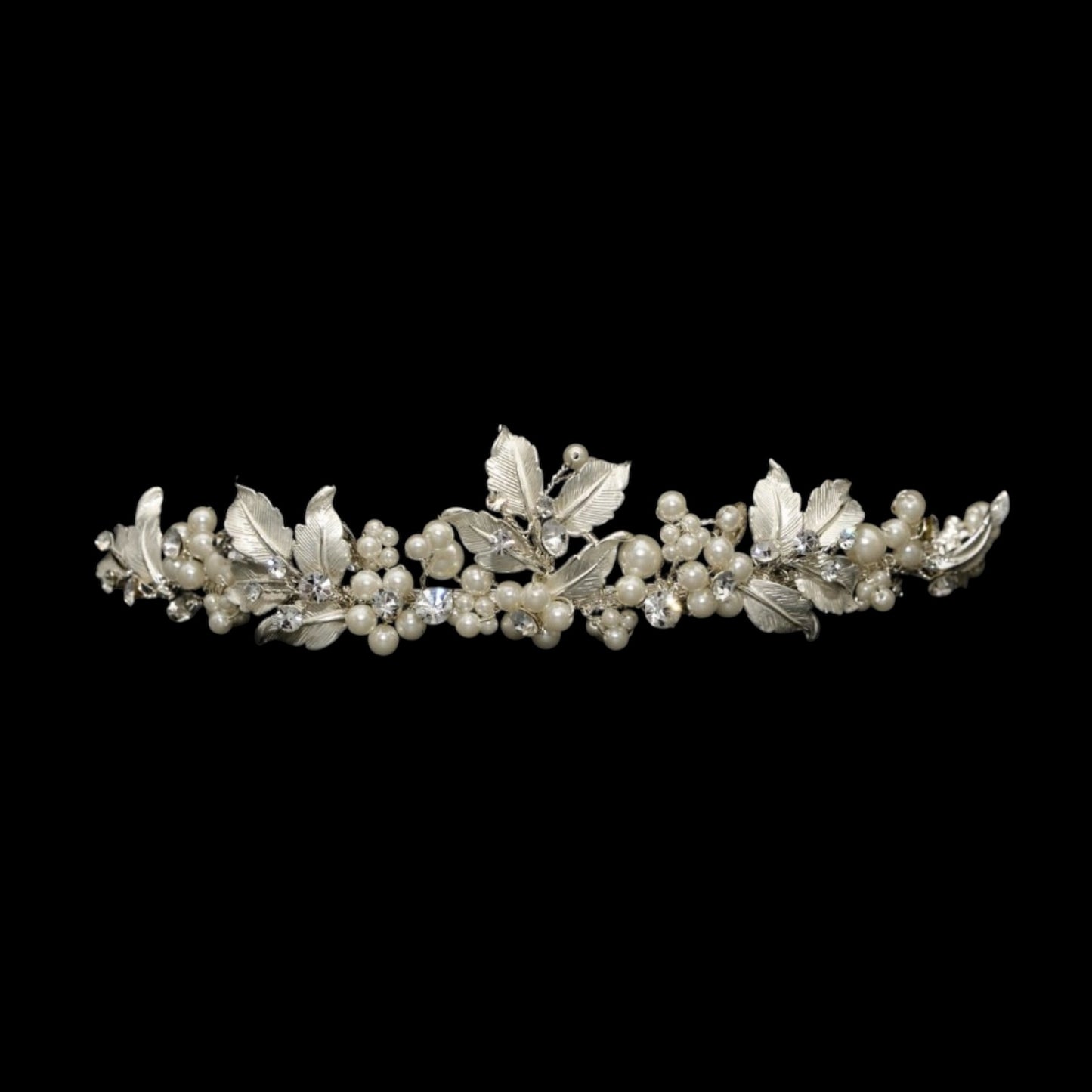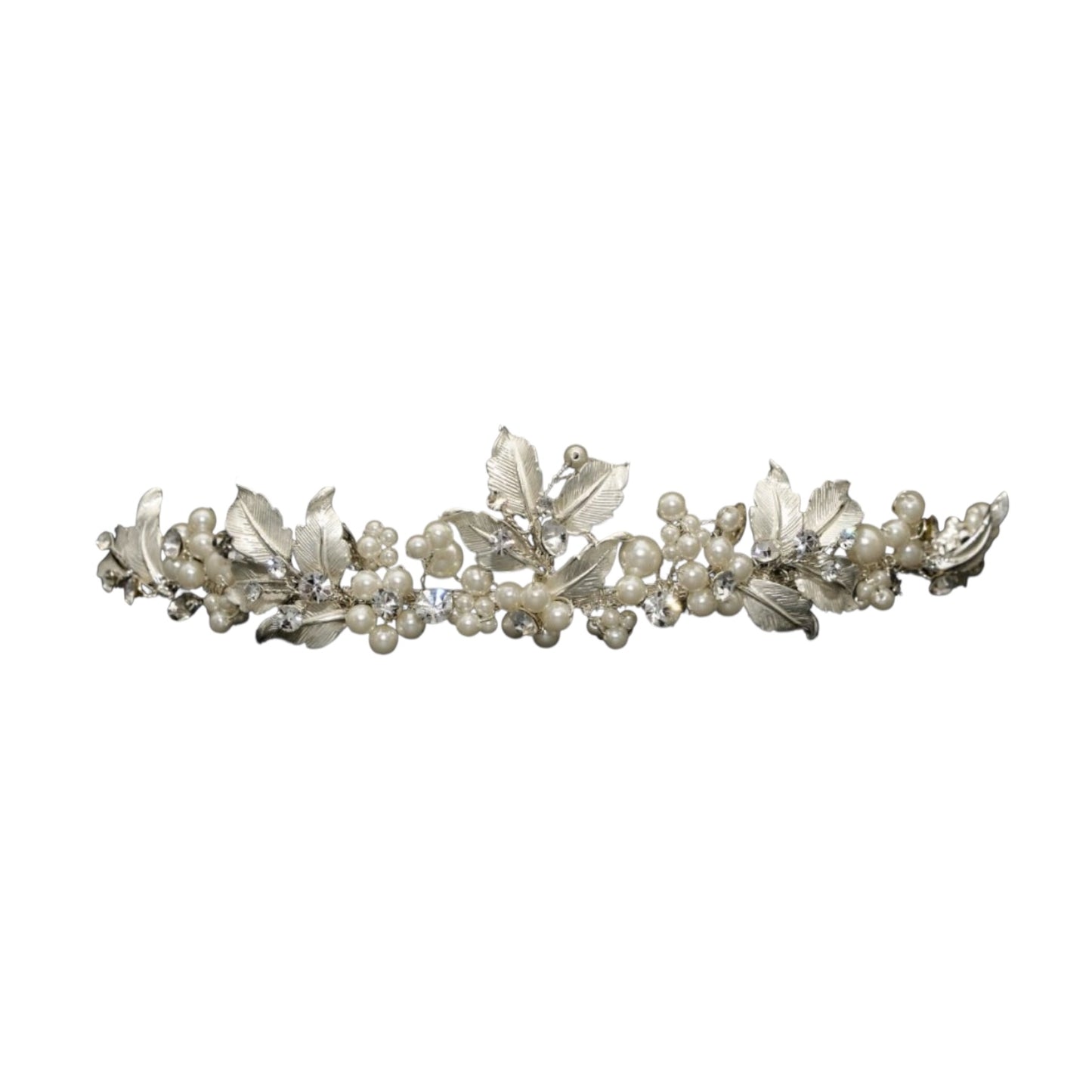 This silver leaf and pearl bridal tiara is a refined wedding headpiece designed for modern brides seeking understated luxury. Intricate silver leaves, luminous pearls, and sparkling crystals create an elegant finish that enhances your bridal look without overpowering it.