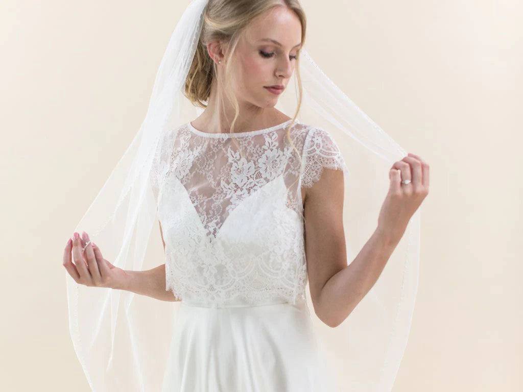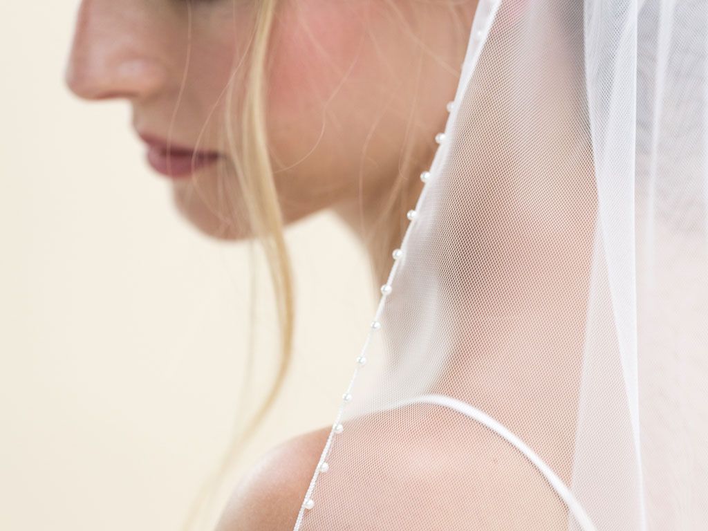 A simple yet stunning hip length bridal veil, made from beautiful ivory Italian tulle and finished with an elegant pearl edge. The veil comes complete with a comb attached to secure into the hair.