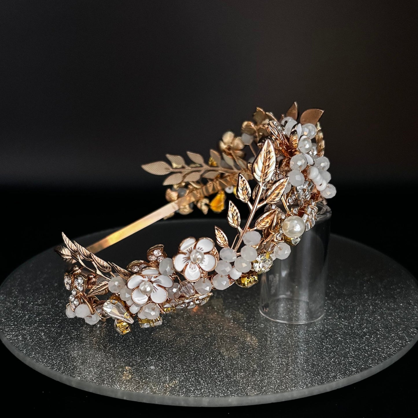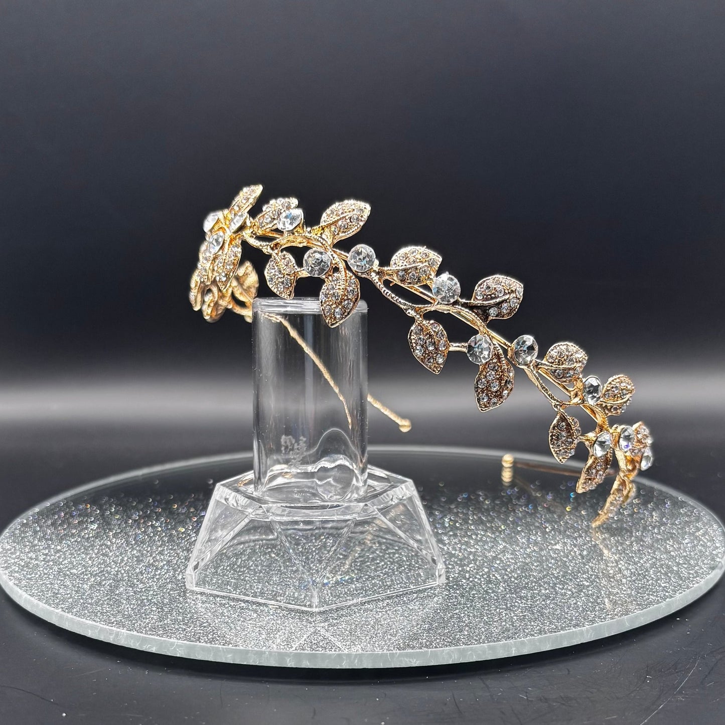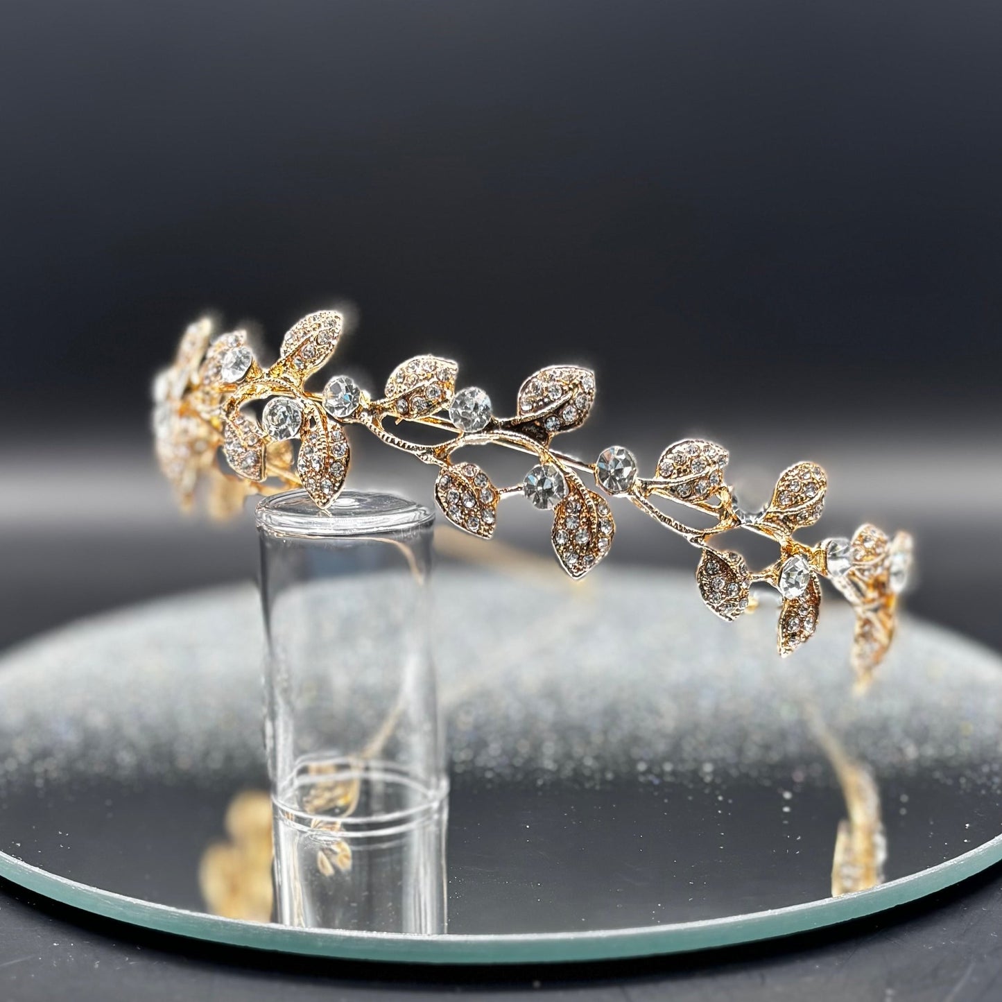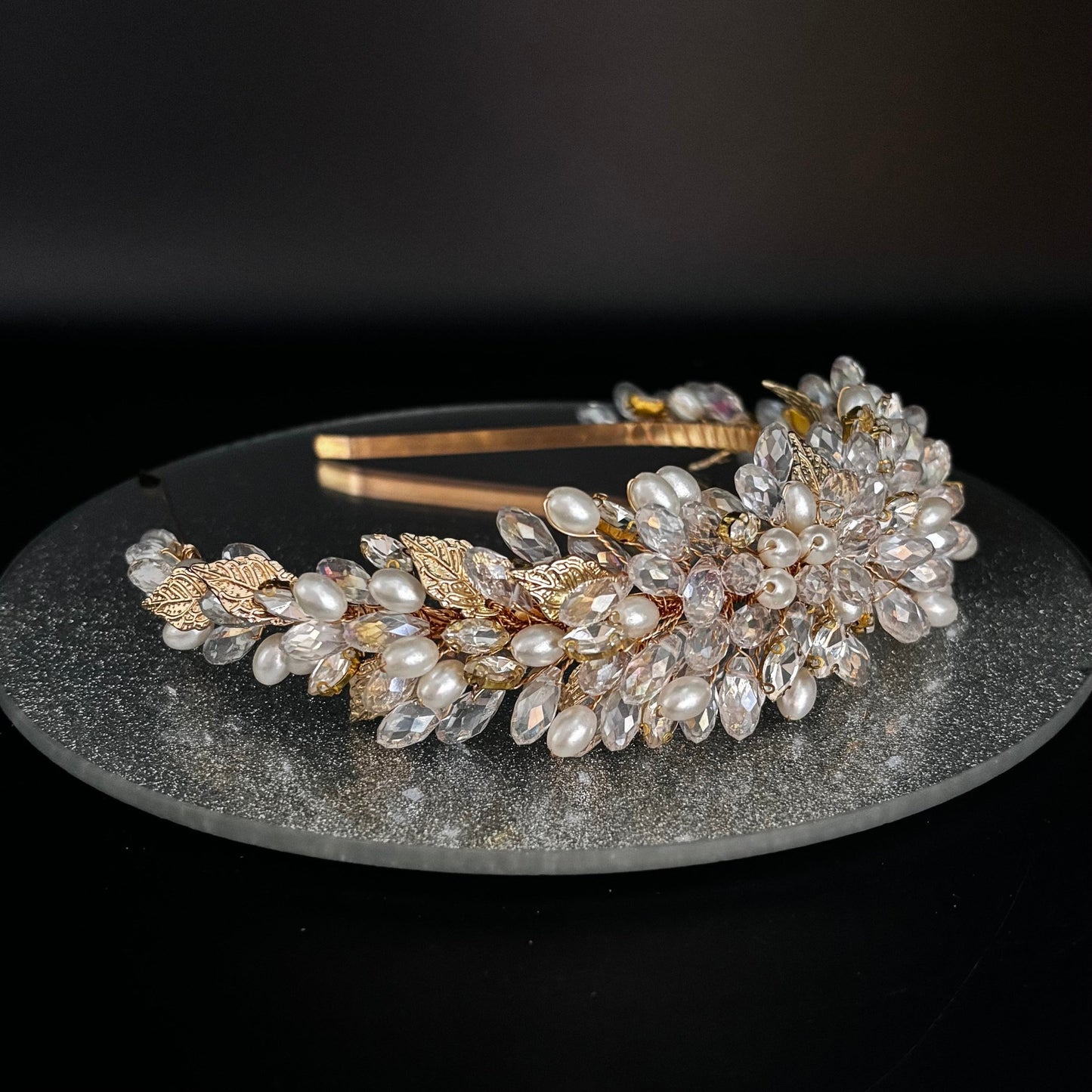 Gold Bridal Headband Embellished with Leaves, Crystals & Pearls, TT1054