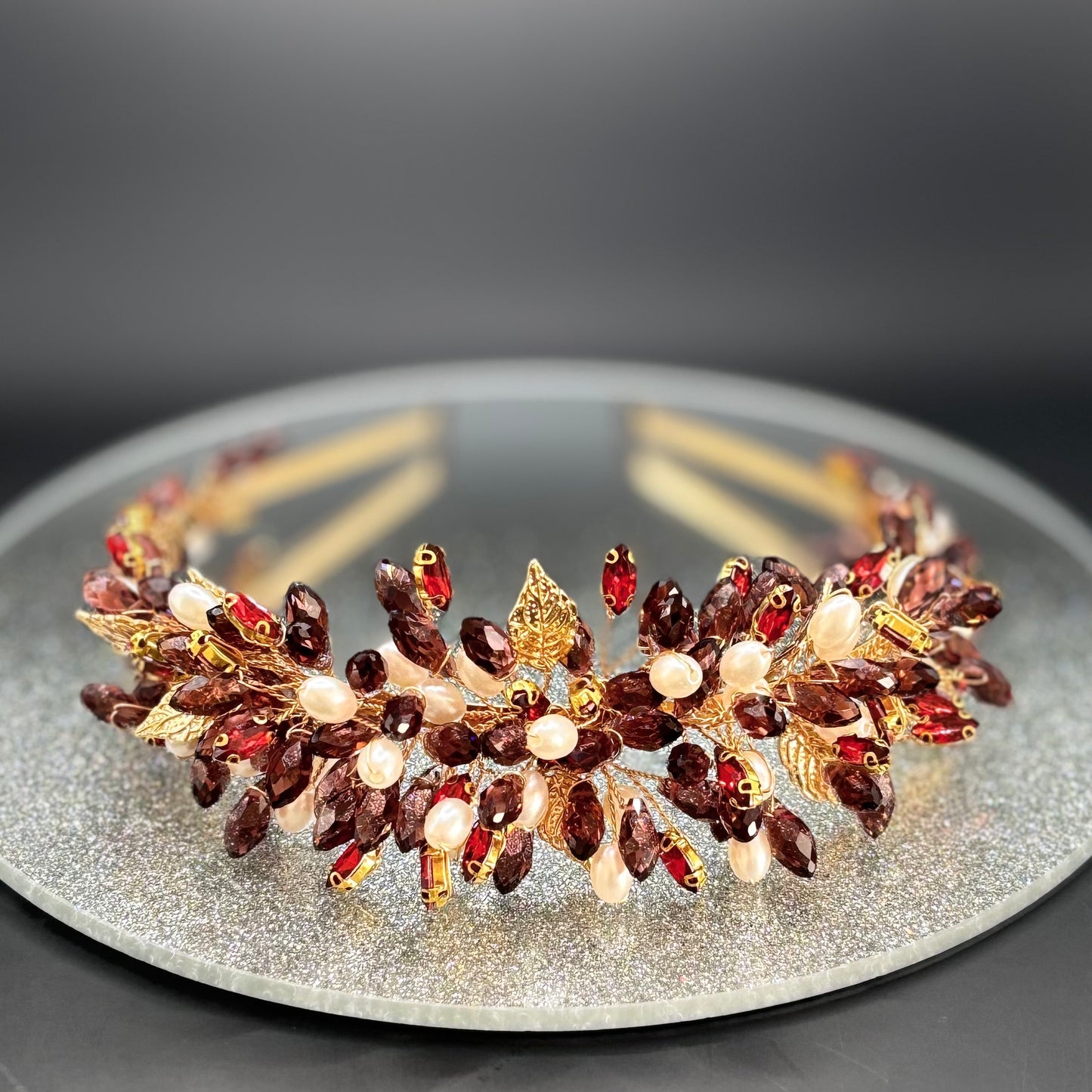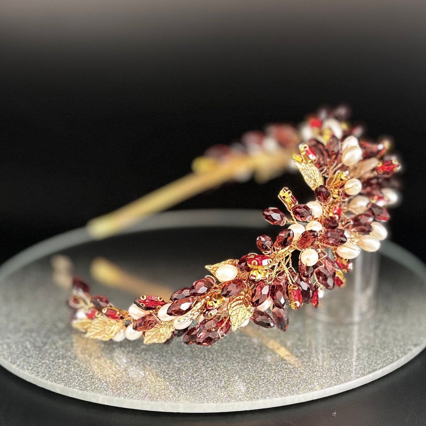 Gold Bridal Headband Embellished with Wine Red Crystals & Pearls TT1038