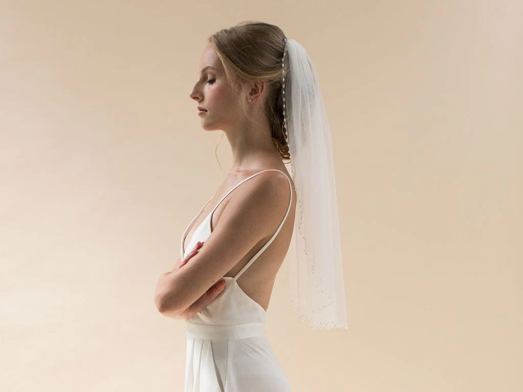 Elegant, timeless, and effortlessly romantic, our waist-length wedding veil is the perfect finishing touch for your bridal look. Falling gracefully to the waist, this veil offers just the right amount of drama while keeping your gown in full view. Lightweight and easy to wear, it complements both classic and modern dress styles, making it a versatile choice for brides who want a touch of tradition without overwhelming their silhouette.
