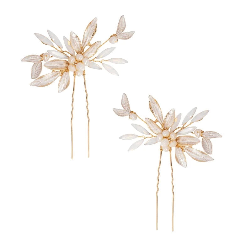 Simply elegant, blush beauty hair pins, embellished with hand painted blush pink leaves, simulated pearls and Opal crystals and then delicately hand-wired onto a gold coloured finish pin. These hair pins look wonderful, intricately placed through many different wedding hairstyles to create the most prettiest look. In each set there are two pins.