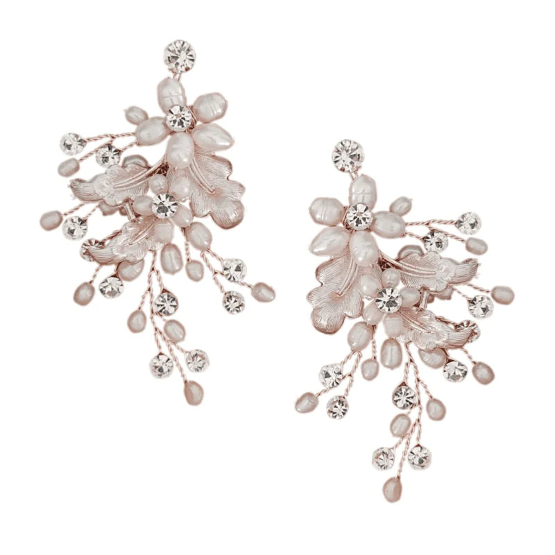 Allow the sumptuous radiance of these beautiful bridal blush pink earrings to bring a shimmering glow to perfect your wedding look. A show stopping astral burst of simulated ivory pearls and hand painted blush pink leaves are hand wired onto a rose gold vine. Dazzle and delight onlookers with the lustre of these glamorous earrings to add that finishing touch to your bridal look.