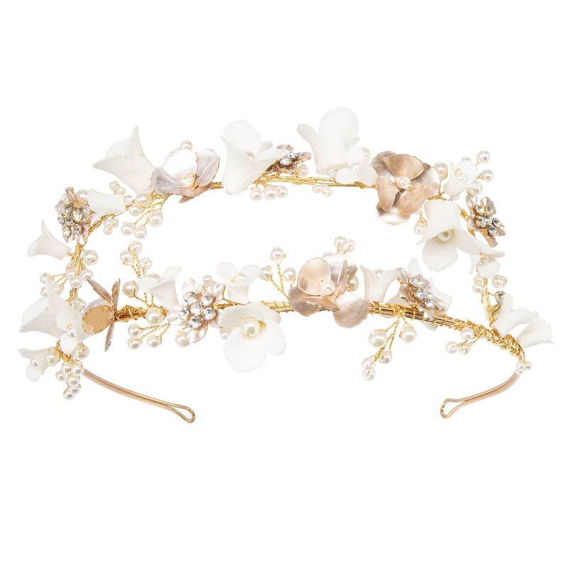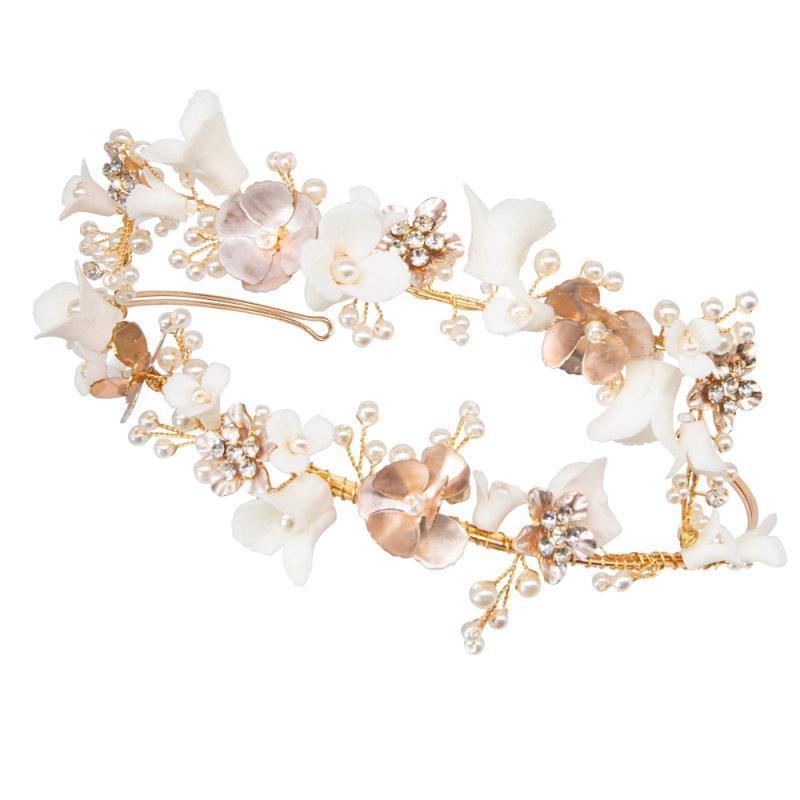 This beautiful bridal headband has delicate hand painted porcelain pink blush flowers and cocooned amongst a lush variety of crystal embellished flowers, simulated pearls and crystals. An intricate finish to bring harmony and sweetness to your look.