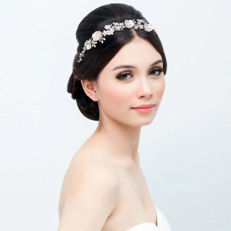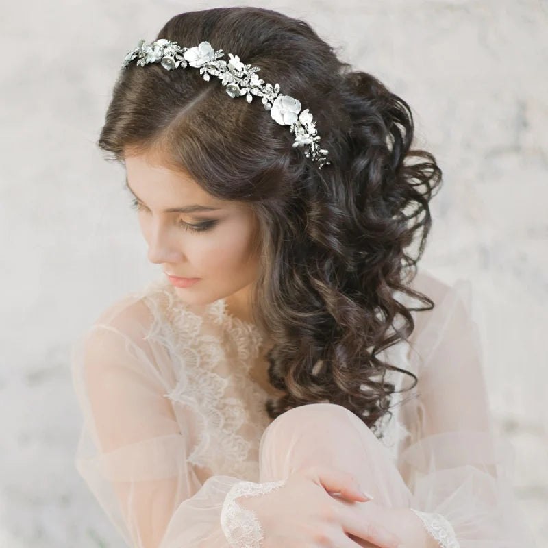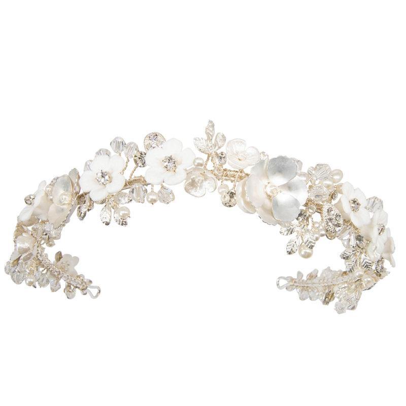 Brides Silver Floral Headband, Porcelain Flowers, Crystals 7582