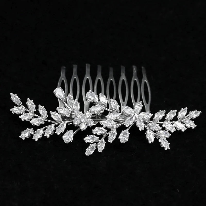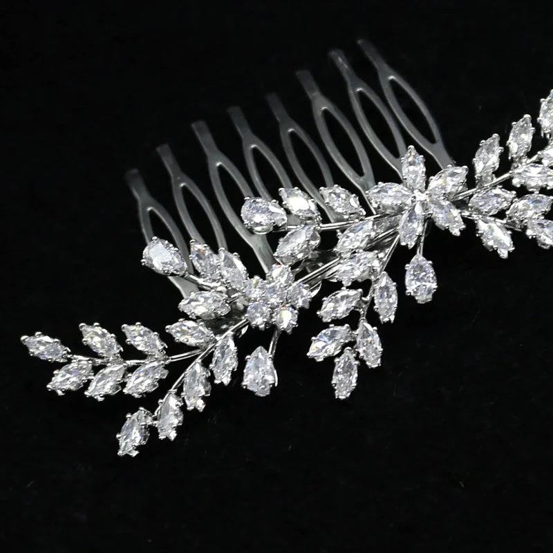 The romantic ethereal beauty of this glamorous silver bridal headdress is a feast for heart and eyes. The headpiece has been delicately created with densely pave set flowers, surrounded by intense sprigs of marquise cut crystals which dance in harmony with ethereal crystals. A stunning bridal hair comb to add that finishing touch to your special day.