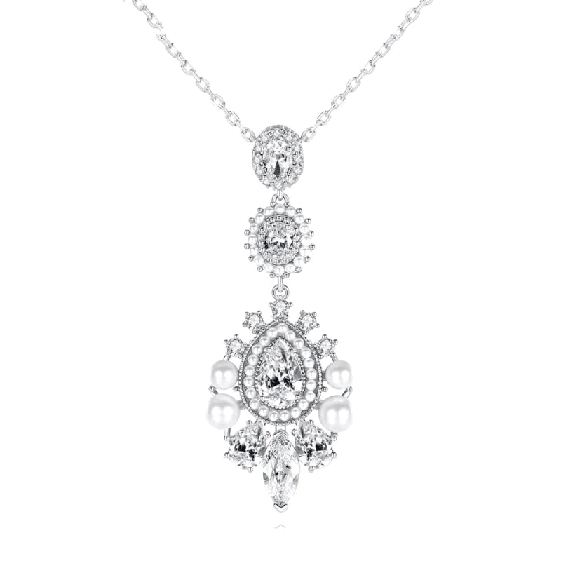 An exquisite crystal and pearl necklace, beautifully embellished with simulated light ivory pearls and clear crystals on a silver finish in a striking chandelier design. A stunning piece of wedding jewellery to add the finishing touch to your bridal look.