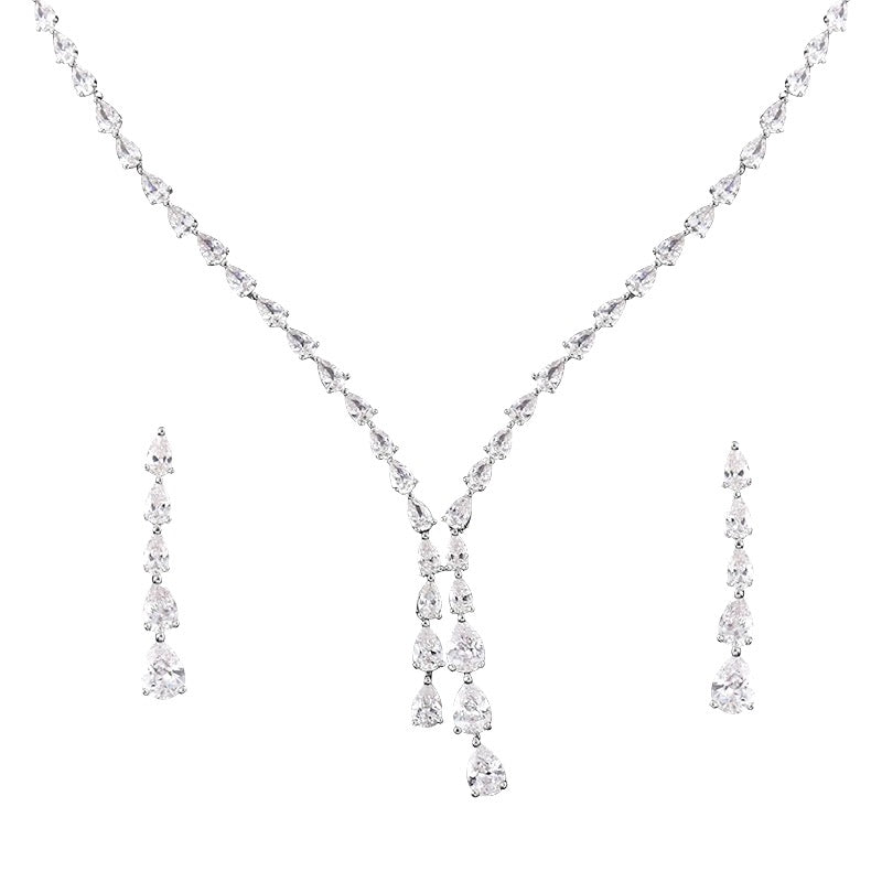 A breathtaking necklace set designed to capture Hollywood red carpet glamour. The beautiful set comes complete with matching earrings. A cascade of sparkling pear cut crystals. The really is a show stopping jewellery set for making a statement at a special event or to add a touch of glamour and sparkle to your bridal look.