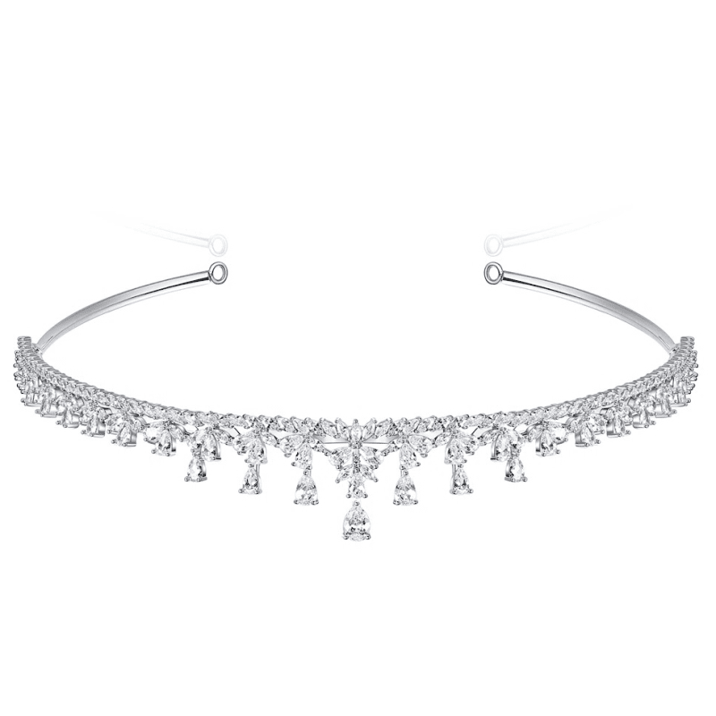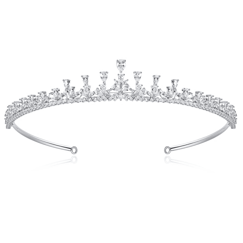 Create a breathtaking look on your wedding day with the intense glory of this beautiful crystal wedding tiara, plated in 18k White Gold. The exquisite delicacy of this luminous coronet evokes the legendary beauties of the golden age of Hollywood. The perfect symmetry of this bridal headpiece allows the exemplary crystal work to steal the show; from a bed of intensely set brilliant cut crystals delicate pavé set crescents rise, leading to an apex of slender pear cut crystals.