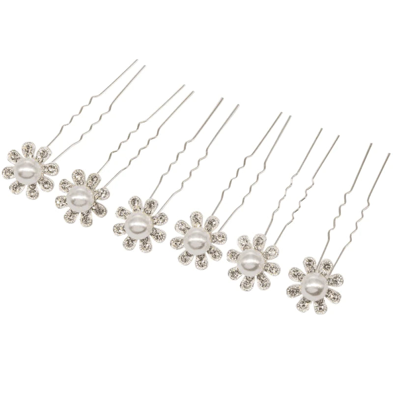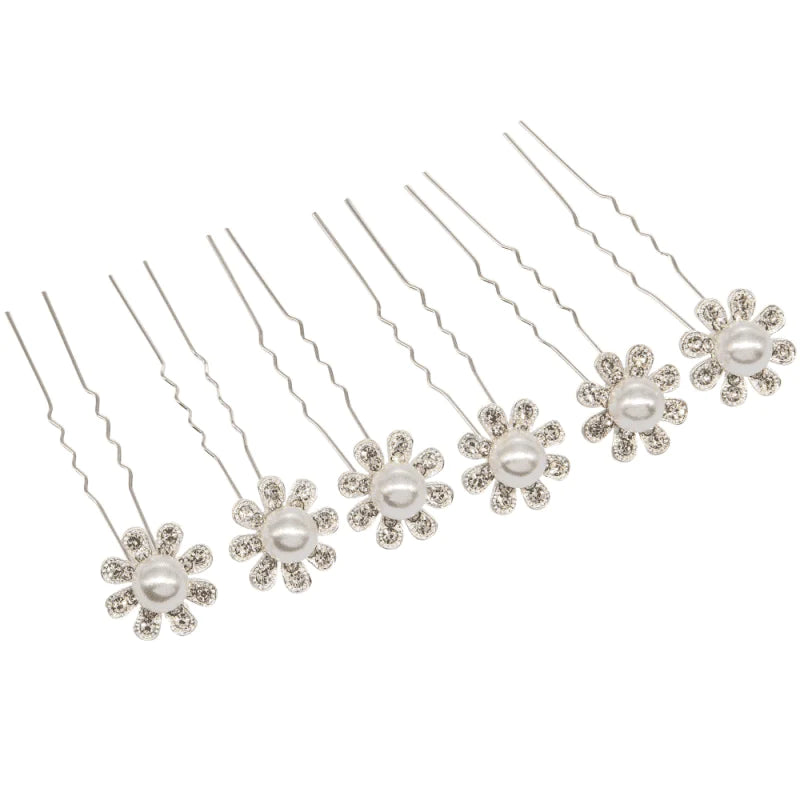 Simplistic but beautiful, these wedding hair pins are embellished with clear crystals with a simulated ivory pearl in the centre of each crystal flower and then delicately hardwired onto a silver finish pin. These hair pins look wonderful scattered through many different wedding hairstyles to create the most prettiest look. In each set there are six pins. The hair pin has just one single flower attached to each silver coloured pin.