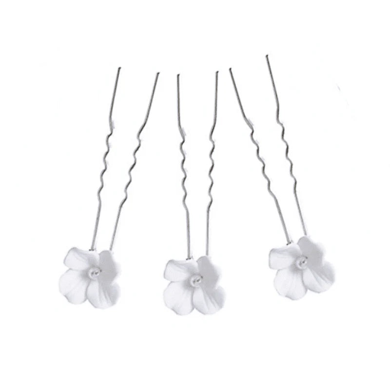 Simplistic but beautiful, these handcrafted ceramic floral hair pins are decorated with simulated ivory pearls in the centre of each flower and then delicately hardwired onto a silver finish pin. These hair pins look wonderful scattered through many different wedding hairstyles to create the most prettiest look. In each set there are three pins. The hair pin has just one single flower attached to each silver coloured pin.