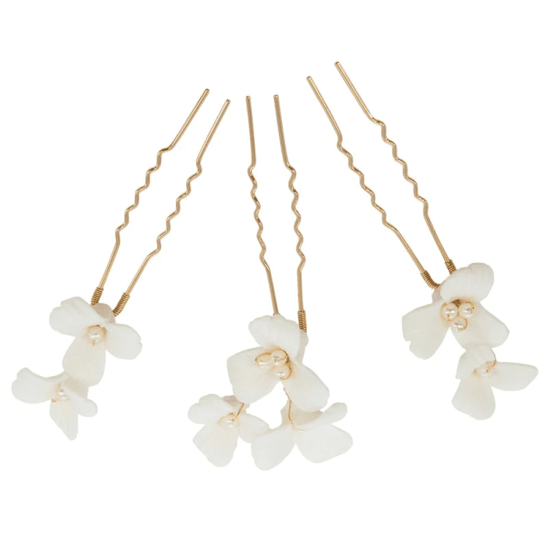 Beautiful handcrafted ceramic flower hair pins, beautifully decorated with ivory pearls in the centre of each flower and then delicately hardwired onto a gold finish pin. These hair pins look wonderful scattered through many different wedding hairstyles to create the prettiest floral accent. In each set there are three pins. One pin has three flowers and the two other pins are smaller with just two flowers attached.