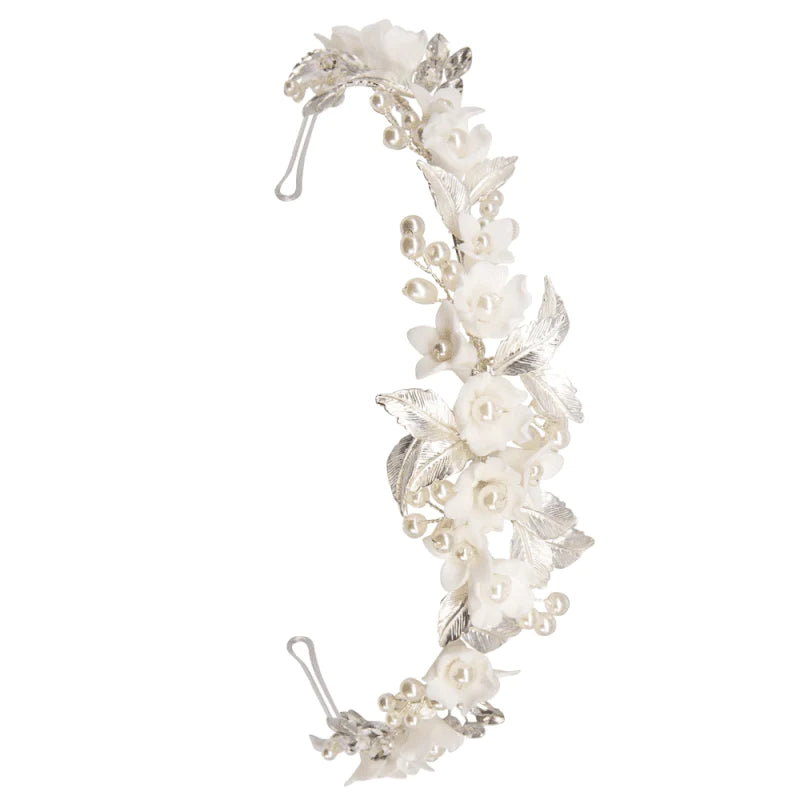 The intricate detailing on this beautiful bridal headband will bring harmony and enchantment to your special day. This gorgeous headdress has been crafted with an alluring flourish of delicate clay flowers which are then embellished with shimmering ivory pearls and cocooned by a cloud of vintage style metallic leaves.