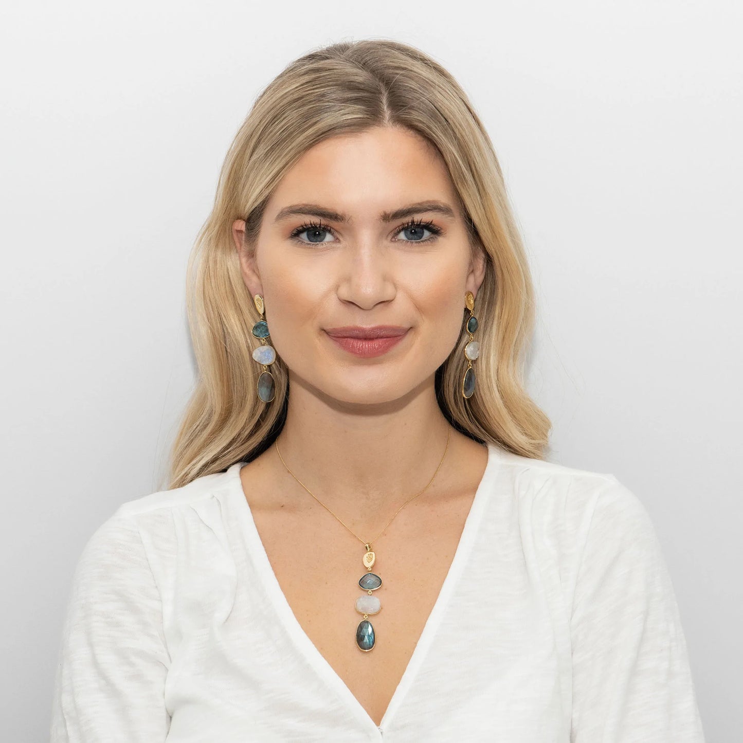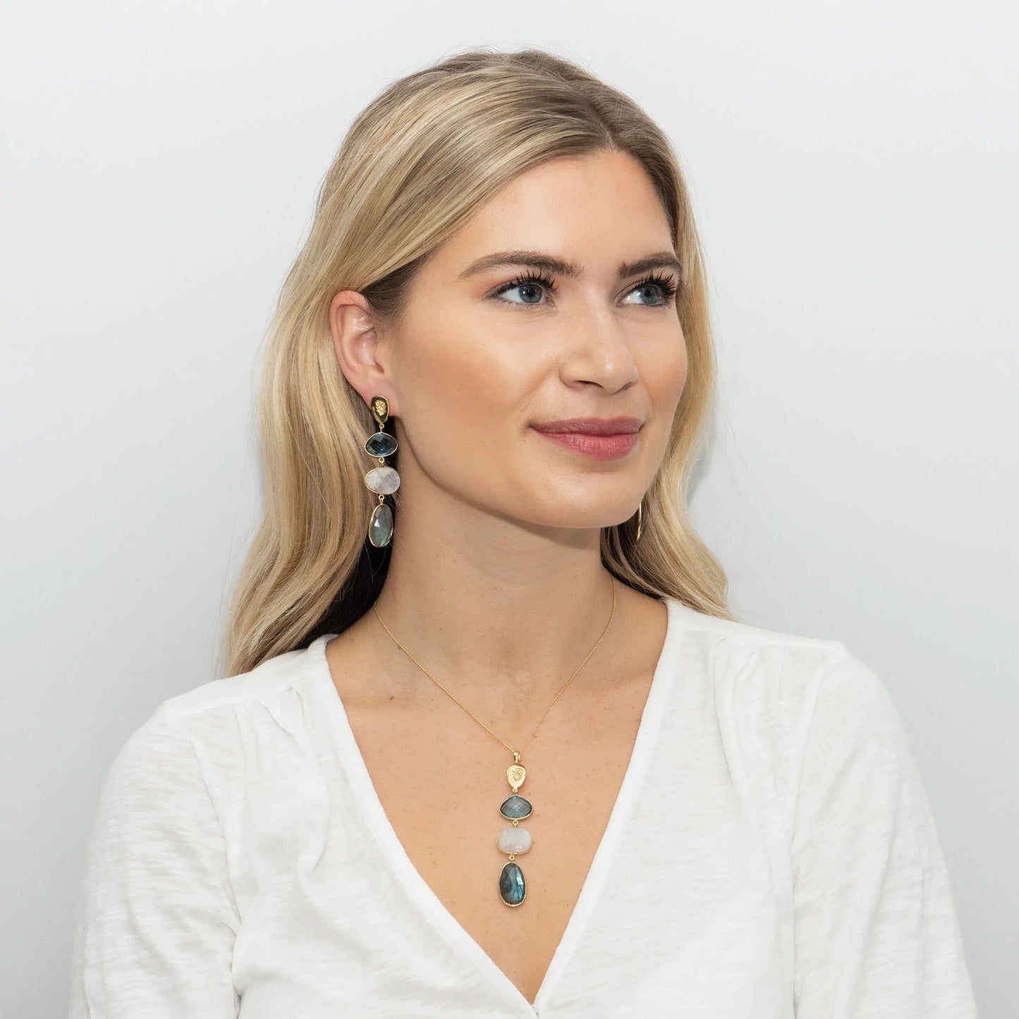 Regular price £110.50Make a striking impression with this exquisite multi-gemstone drop pendant. It showcases a faceted Iolite Hydro at the top, followed by a rough cut Rainbow Moonstone, and a faceted Labradorite at the base—each stone carefully selected to highlight its natural hues and textures. Due to the distinct nature of semi-precious stones, colour and translucency may differ with each piece. The pendant is elegantly crafted in 14ct Gold Plated jeweller’s brass with a polished high-shine finish. It includes a delicate 18″ Gourmette chain in Sterling Silver 925, adorned with matching 14ct Gold Plated Vermeil, and a 2″ extension for adjustable wear.