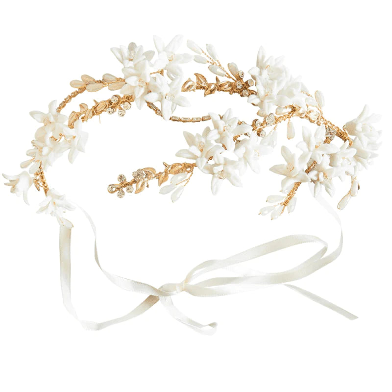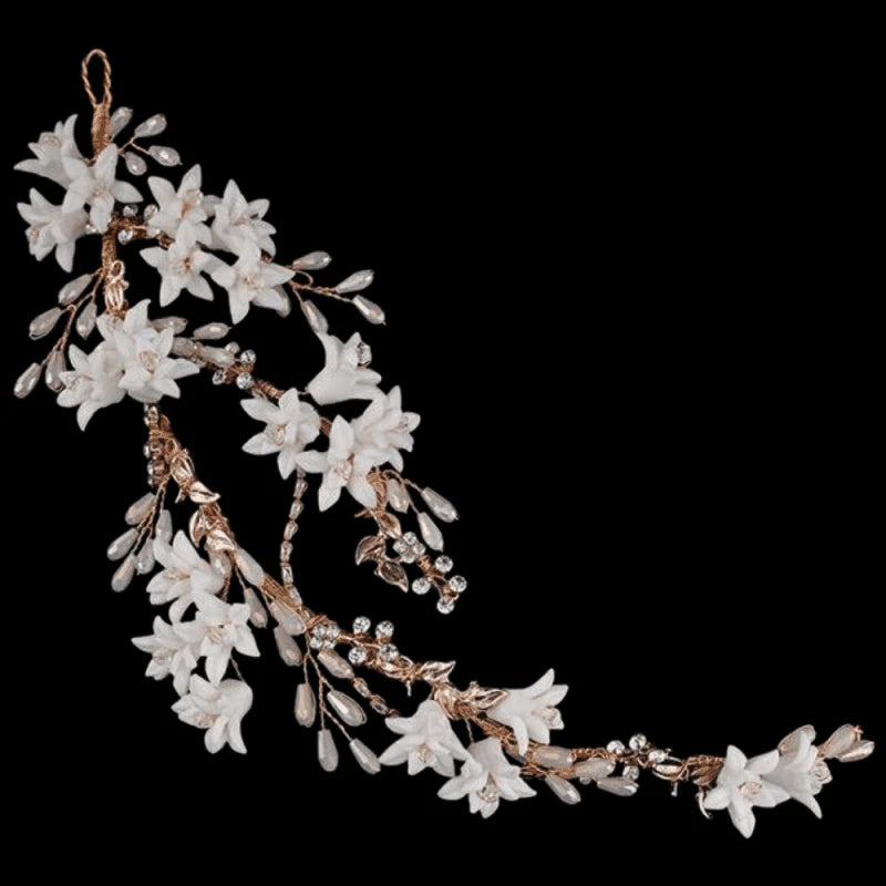 Evoke the spellbinding beauty with the ethereal femininity of this breathtaking flexible brides hair vine. This luxurious bridal headdress has been intricately crafted and rich with delicate ceramic flowers, glowing seed pearls and set amongst marquise gold leaves, simulated ivory pearls and sparkling crystals, a wedding headpiece which is sure to delight. The delicate flowers and crystals on this beautiful hair vine evoke the beauty of a true princess fit for a fairytale wedding.