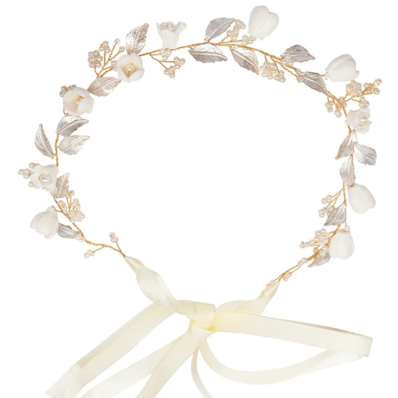 Evoke the spellbinding beauty with the ethereal femininity of this breathtaking flexible brides hair vine. This pretty bridal headdress has been Intricately crafted and rich with delicate ceramic flowers, glowing ivory pearls, clear crystals and set amongst hand painted blush pink leaves on a gold vine. A beautiful wedding headpiece which is sure to delight. The delicate flowers on this beautiful hair vine evoke the beauty of a true princess fit for a fairytale wedding.