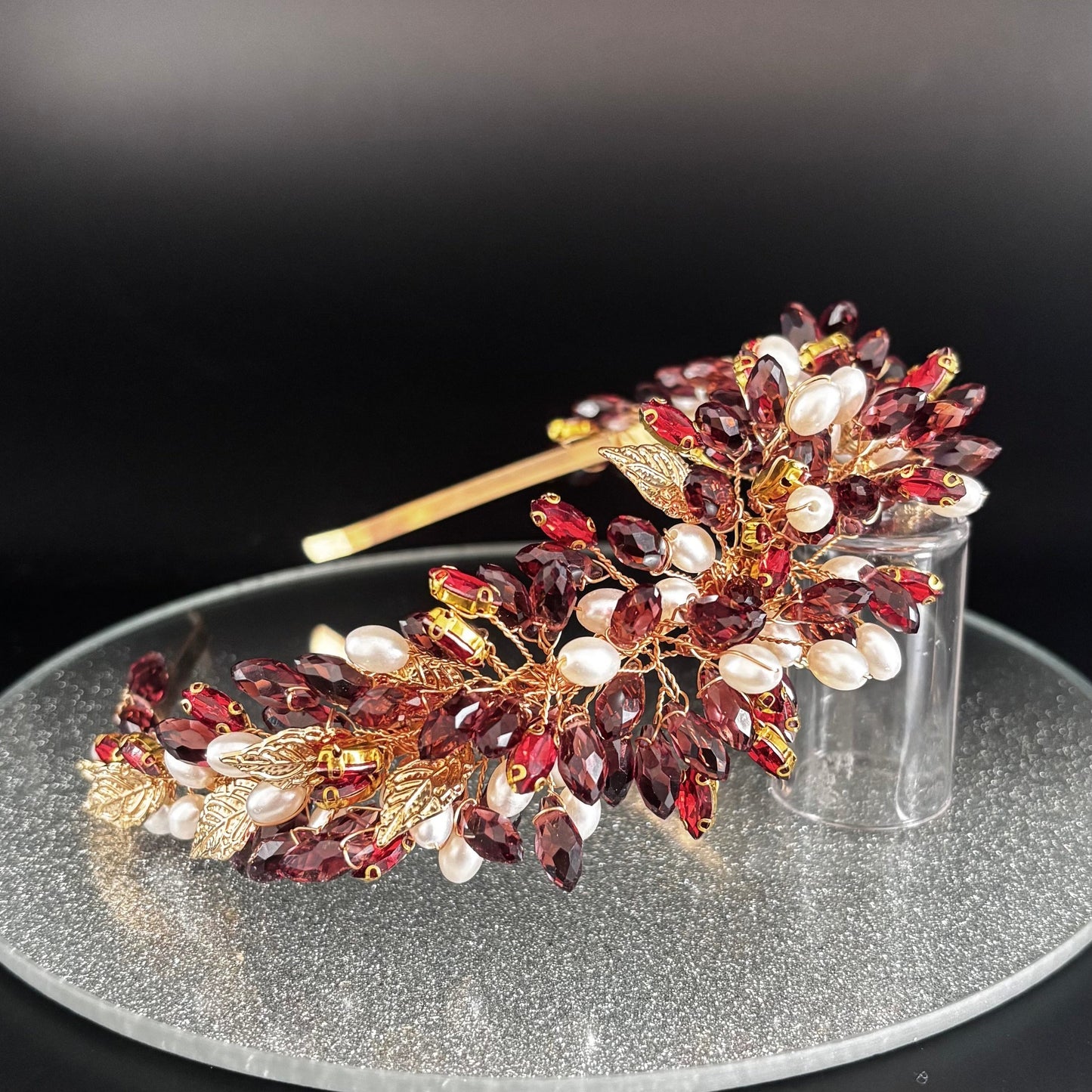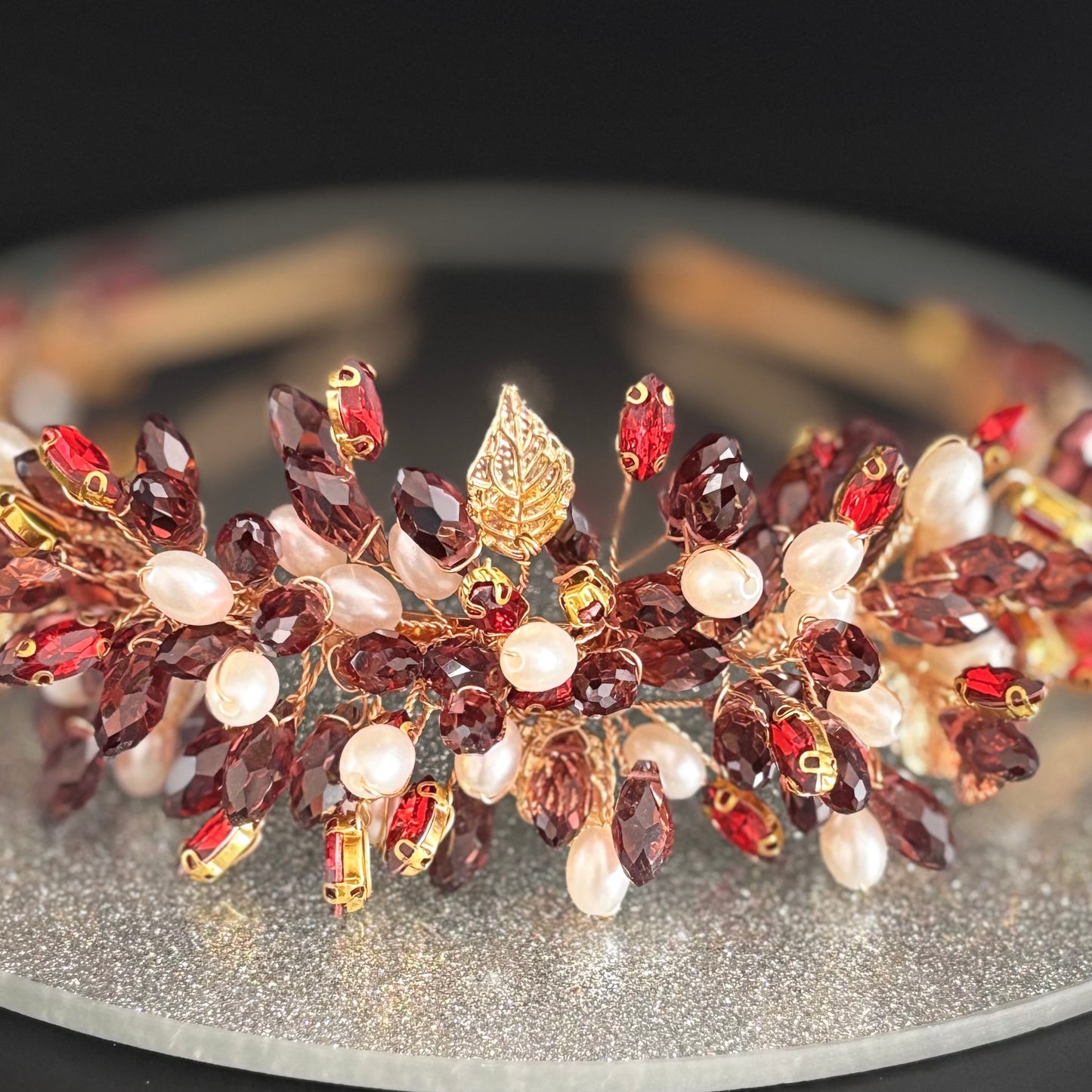Indulge in the luxurious opulence of our Gold Bridal Headband, adorned with rich wine red crystals and luminous ivory pearls intertwined with delicate gold leaf accents, for an elevated and exclusive bridal look. This coveted headpiece exudes sophistication and grace, making it an essential addition to our collection for your special day.