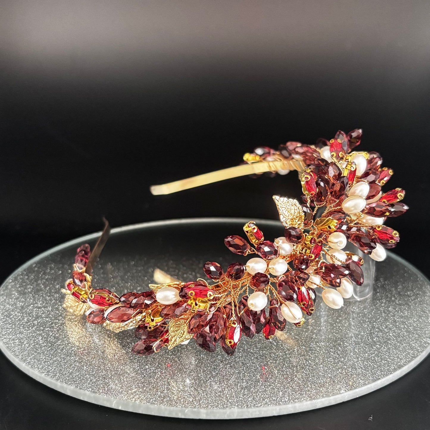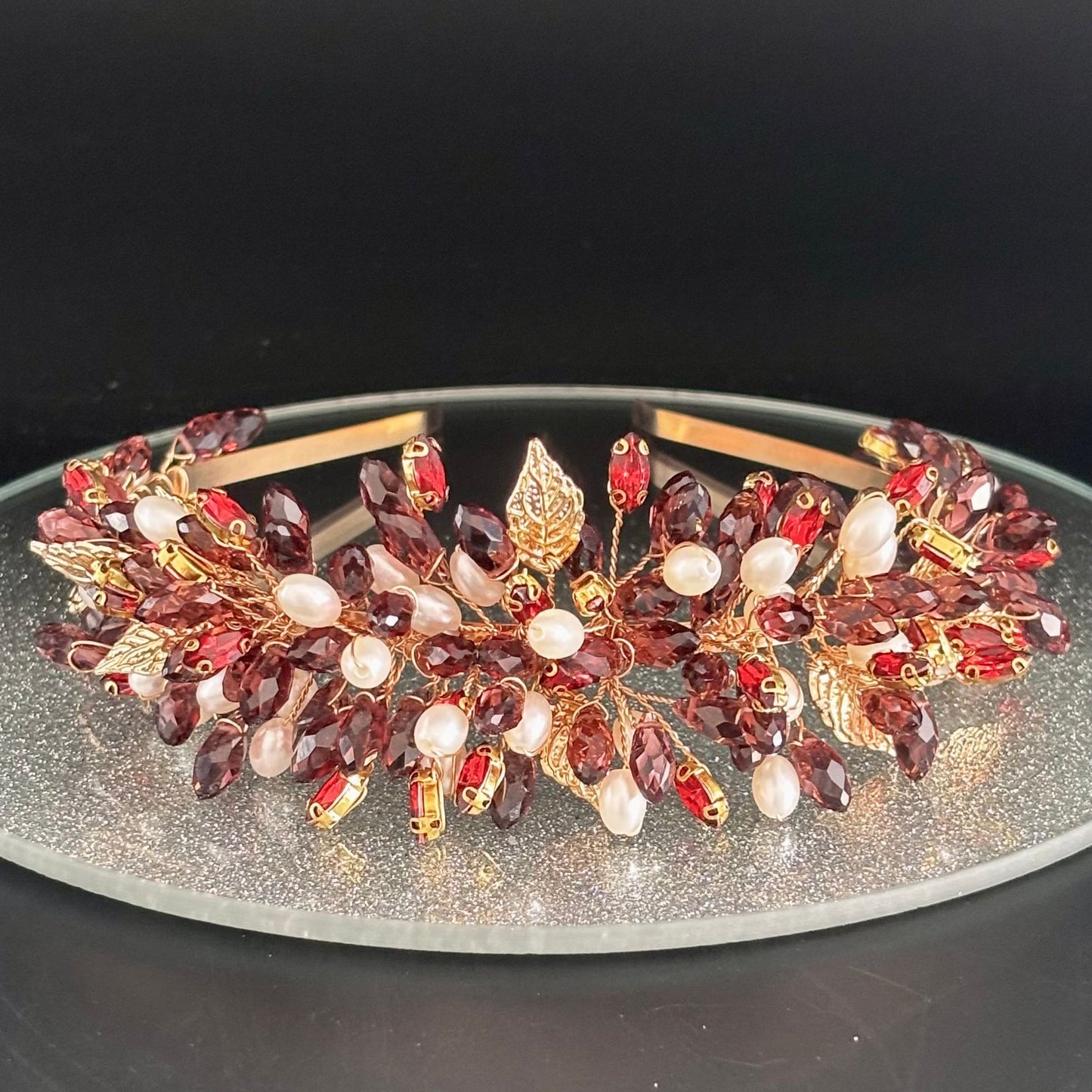 Gold Bridal Headband Embellished with Wine Red Crystals & Pearls TT1038