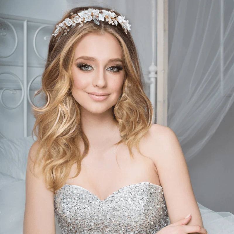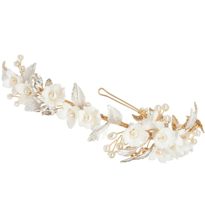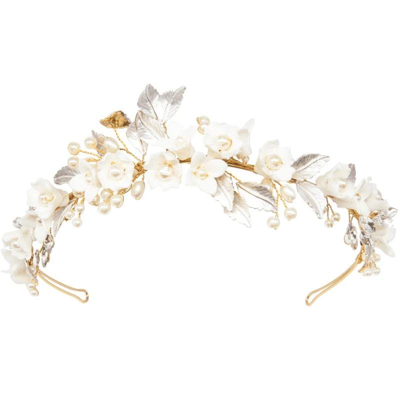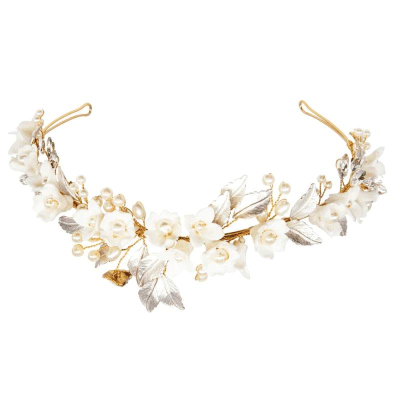 The intricate detailing on this beautiful bridal headband will bring harmony and enchantment to your special day. This gorgeous wedding headdress has been crafted with an alluring flourish of delicate clay flowers which are then embellished with shimmering ivory pearls and cocooned by a cloud of vintage style rose gold metallic leaves.