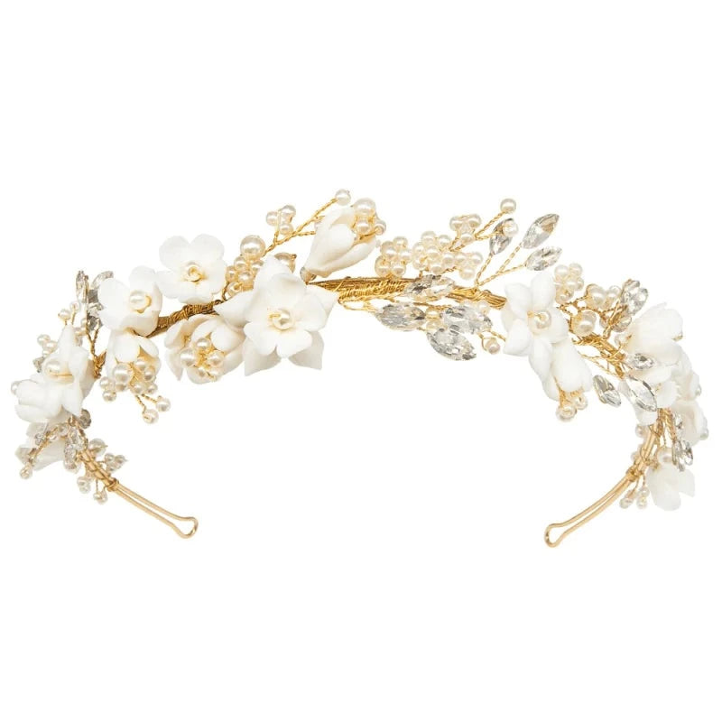 This beautiful floral bridal headband will certainly bring enchantment to your special day. Created with delicate porcelain flowers and surrounded by seeded pearls and sparkling clear cut crystals, all intricately hand wired on to a gold head band. This pretty bridal headpiece is so beautifully finished with such intricate detailing to bring harmony and sweetness to your bridal look.