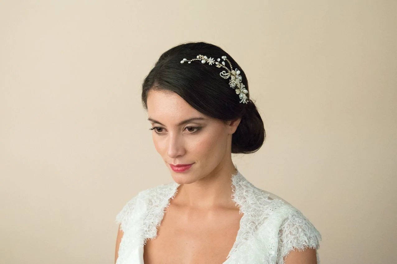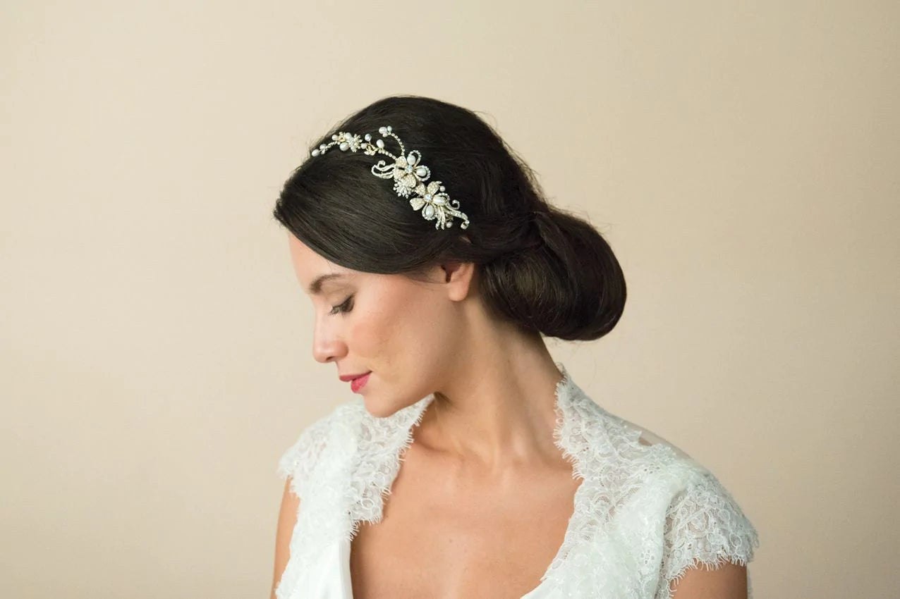 A beautifully intricate bridal hair comb with vintage styling. Large real freshwater pearls in pale ivory have been used to create floral petals and are intertwined with cut solitaire stones, smaller freshwater pearls and tiny pearlised bugle beads set in an elaborate design. This brides crystal headpiece is very versatile and can be worn on the side of a hairstyle or at the back. This piece looks wonderful with dresses accented with lace or elaborate beading but can also suit beach and destination weddings.