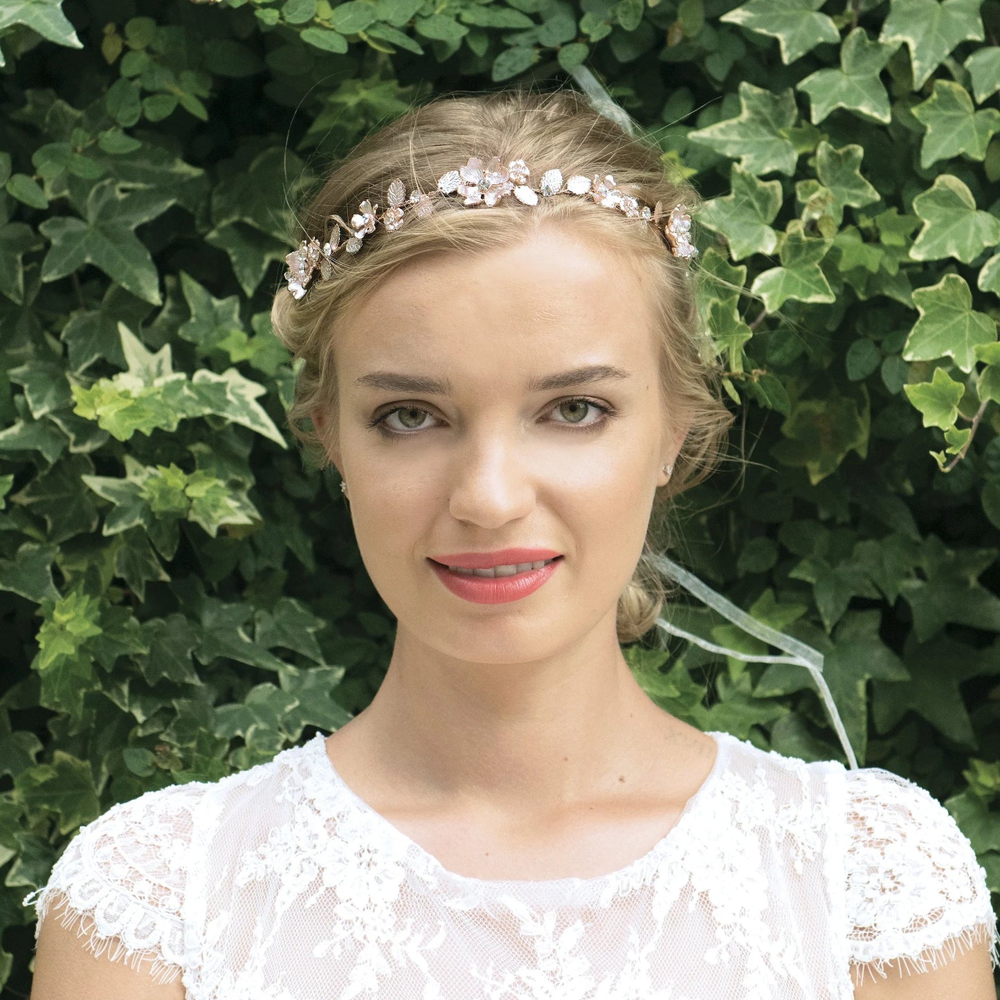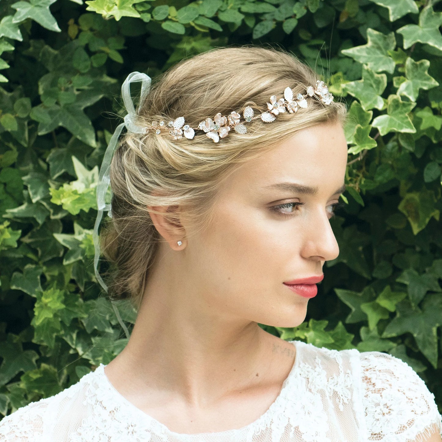 Sienna rose gold Bridal hair vine in a floral design with enamelled rose gold leaves on a flexible metal with an ivory organza ribbon attached. This beautiful bridal headpiece can be worn high on the head as a tiara, over the forehead for a more bohemian look. This beautiful bridal hair vine is perfect for both the bride or bridesmaids to complete your bridal look.