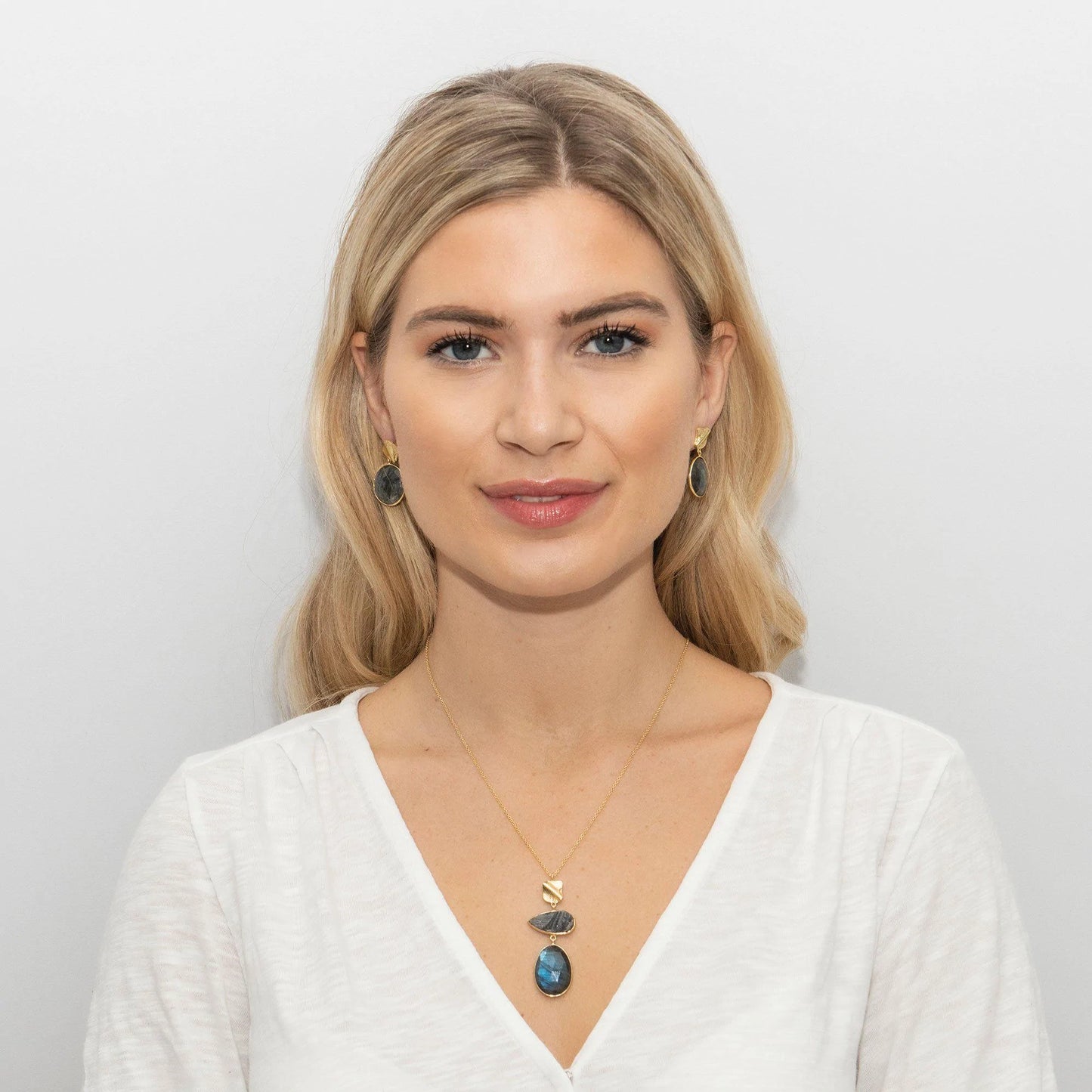 This sophisticated necklace features a striking double drop design, beautifully combining a raw Desert Drussy stone with a faceted Labradorite pendant beneath it. Each gem is meticulously cut to enhance its distinctive hues and natural textures, ensuring every piece is truly one of a kind due to the inherent variations in colour and translucency of these semi-precious stones.