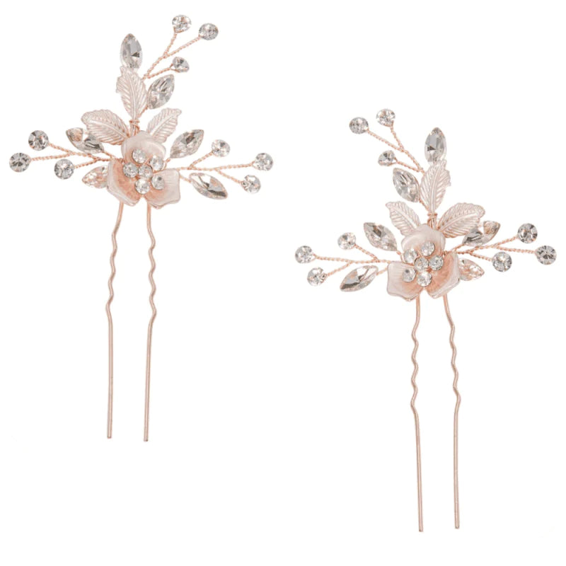 Simple but elegant, silver wedding hair pins, embellished with hand painted leaves and flowers, glistening clear crystals and then delicately hand-wired onto a rose gold finish pin. These beautiful bridal hair pins look wonderful, intricately placed throughout the hair to create the prettiest bridal look on your special day. In each set there are two hair pins.