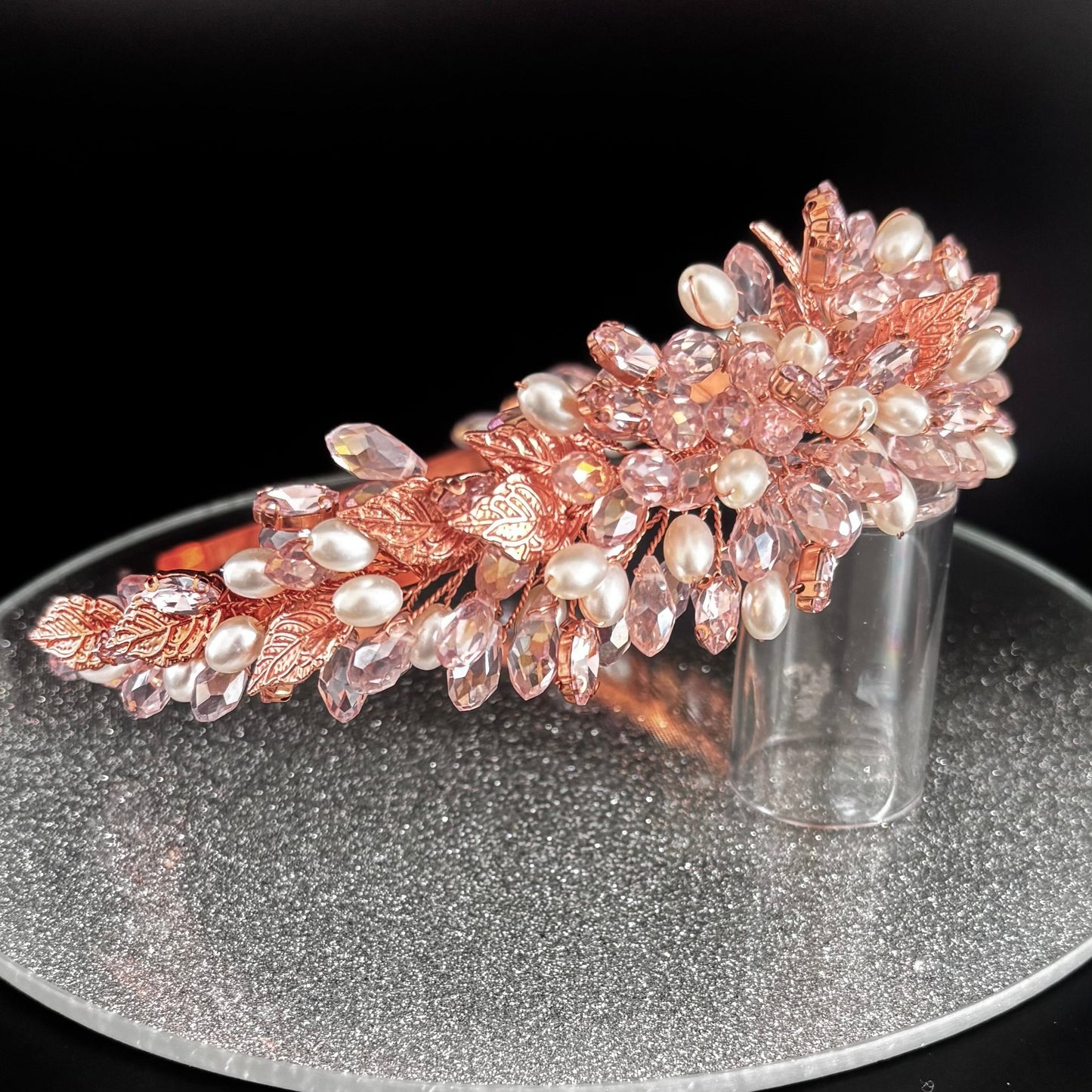 Enhance your bridal ensemble with the opulence of our Rose Gold Bridal Headpiece, embellished with glistening pink crystals and luminous ivory pearls intertwined with rose gold leaf accents. This coveted headdress exudes sophistication and exclusivity, elevating your overall look to a new level of grace and beauty. Make a lasting impression on your special day with this essential addition to our collection.