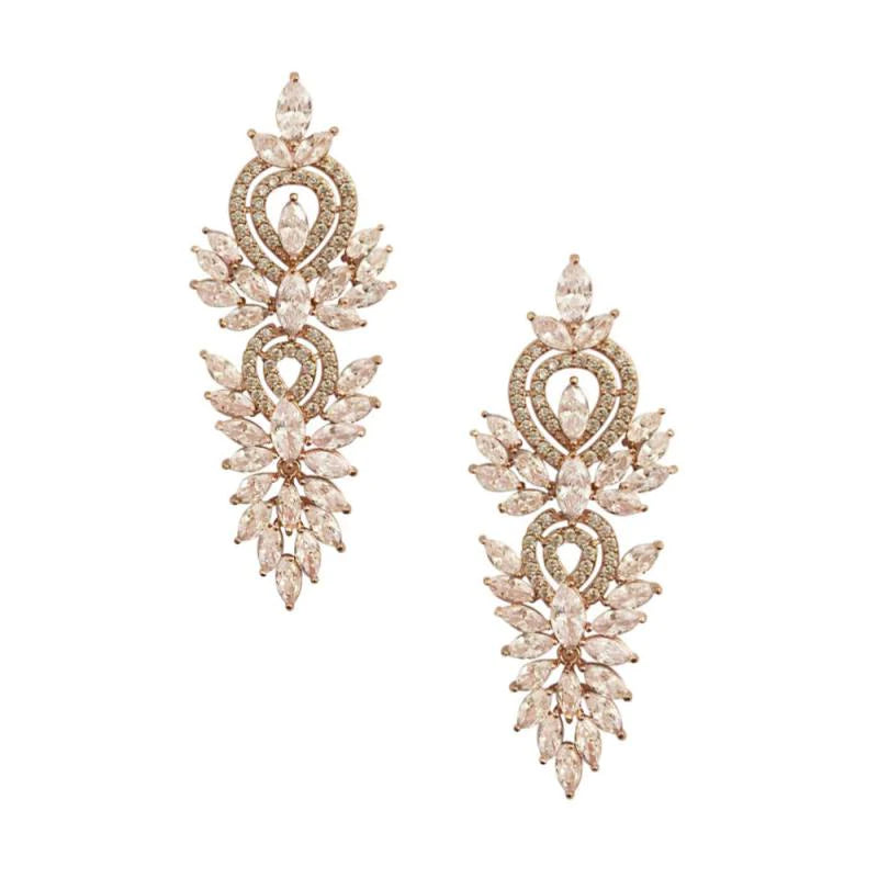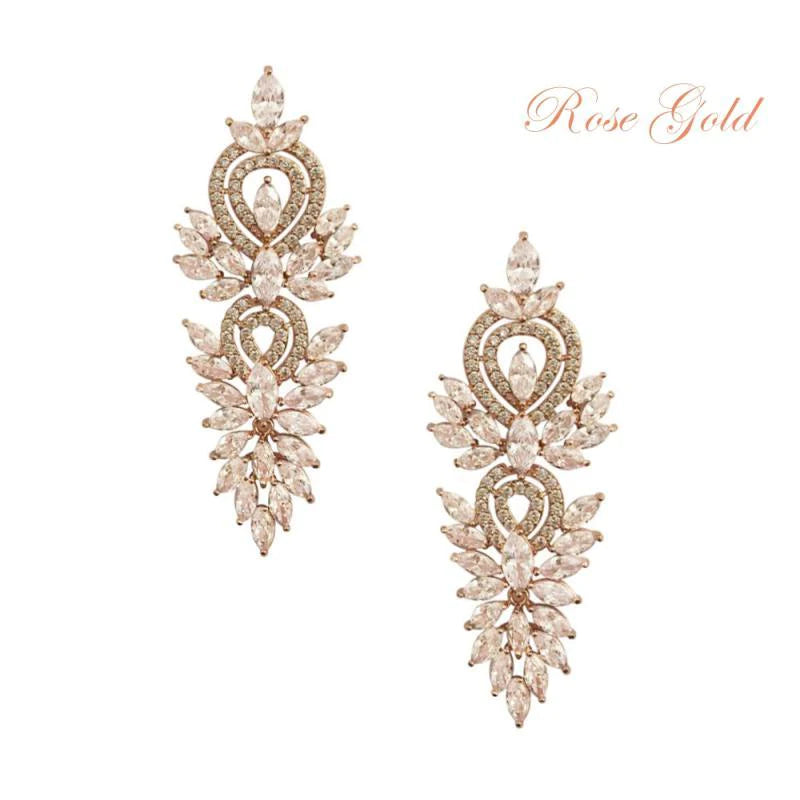 These truly are elegant statement earrings. Set with high quality Cubic Zirconia Crystals on a rose gold plated finish. Beautiful bridal jewellery.