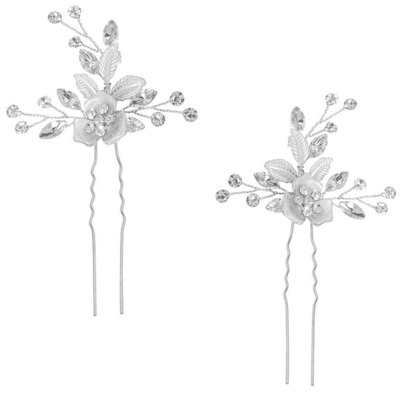Simple but elegant, silver wedding hair pins, embellished with hand painted leaves and flowers, glistening clear crystals and then delicately hand-wired onto a silver finish pin. These beautiful bridal hair pins look wonderful, intricately placed throughout the hair to create the prettiest bridal look on your special day. In each set there are two hair pins.