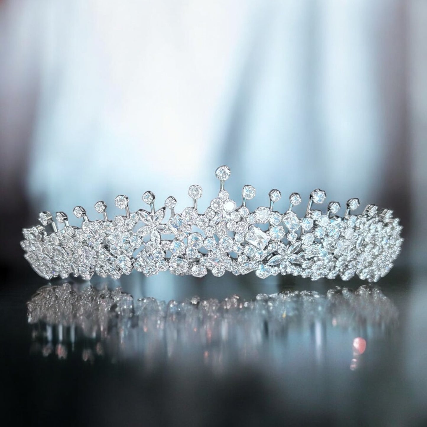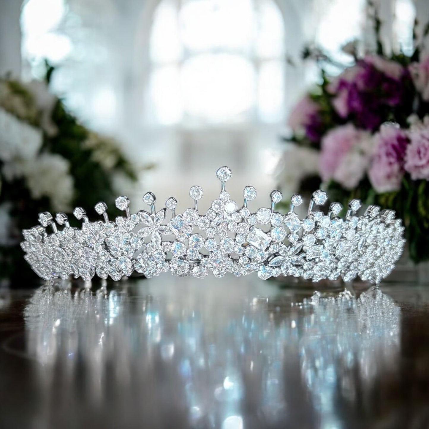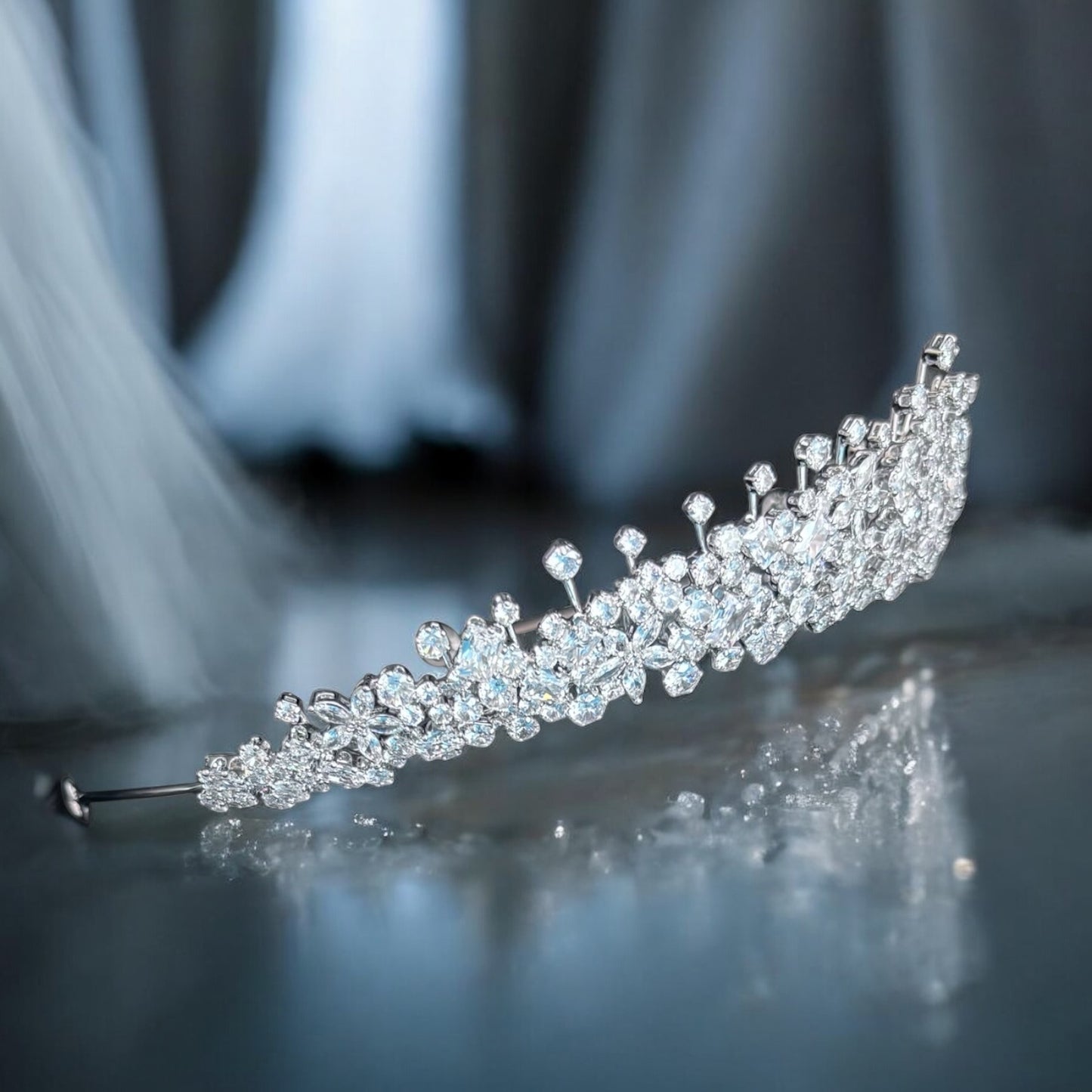 Step into your wedding day with elegance and sparkle in this breathtaking silver bridal tiara. Designed with a dazzling array of round-cut crystals arranged in a floral-inspired pattern, it captures the light beautifully from every angle. The elevated crystal stems create a regal silhouette, giving you the perfect balance of sophistication and fairytale charm.