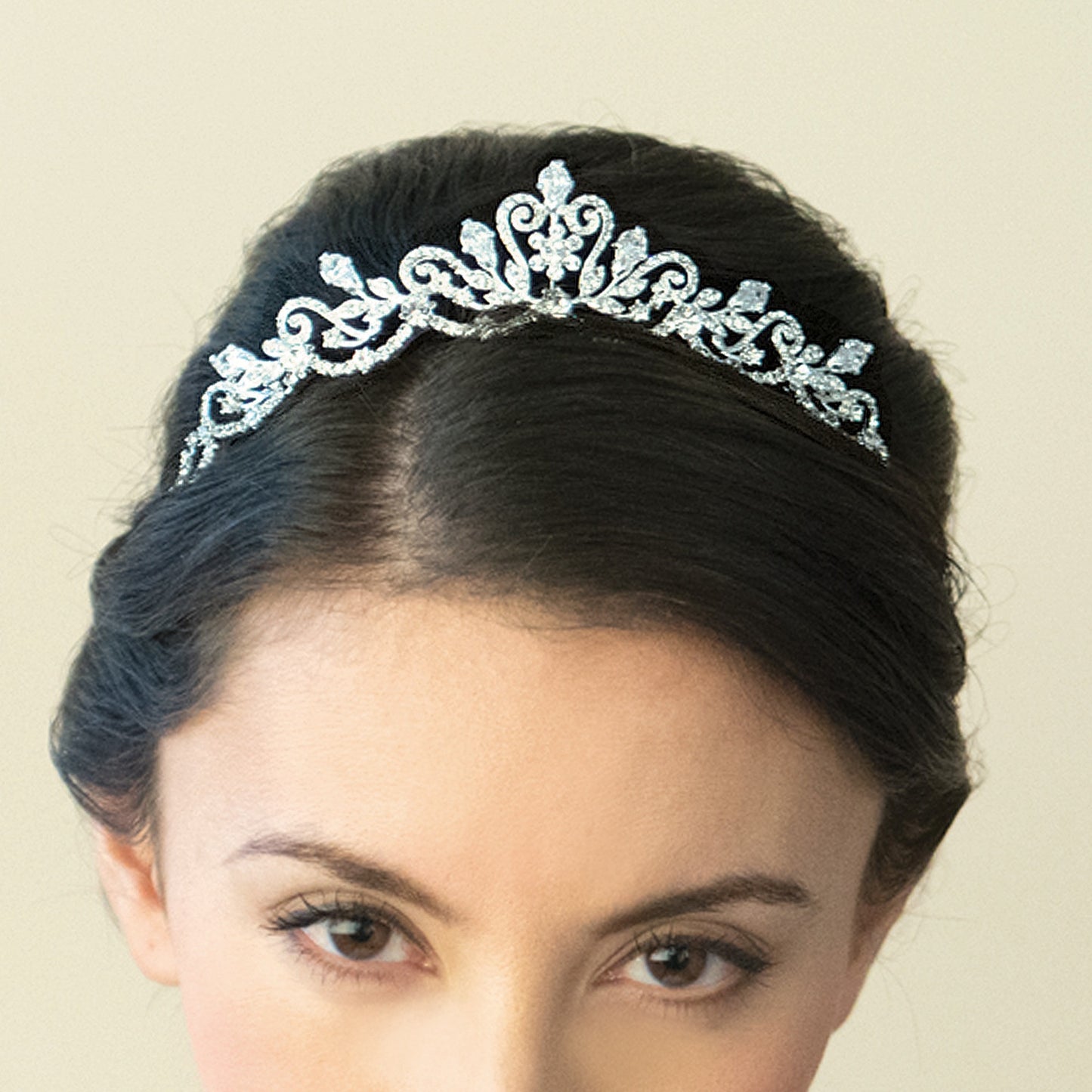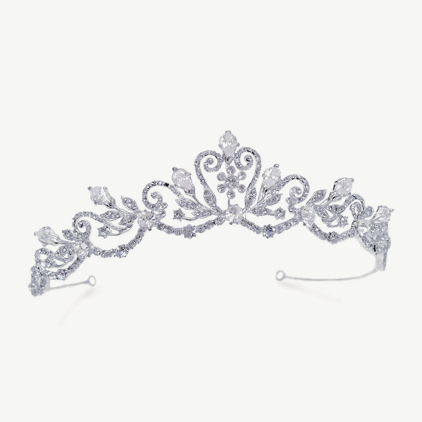Marilyn, is a timeless and elegant choice for your special day. Adorned with genuine Austrian Crystals and Zirconia simulated diamonds, this exquisite tiara features a romantic design of solitaire crystals arranged in delicate swirls. Its scalloped edge is beautifully accented with sparkling teardrop crystals, offering a graceful shimmer that complements classical and 1950s-inspired bridal gowns. Expertly crafted to capture vintage charm with a modern sparkle, this piece adds a refined touch of sophistication and radiant glamour to complete your wedding ensemble.