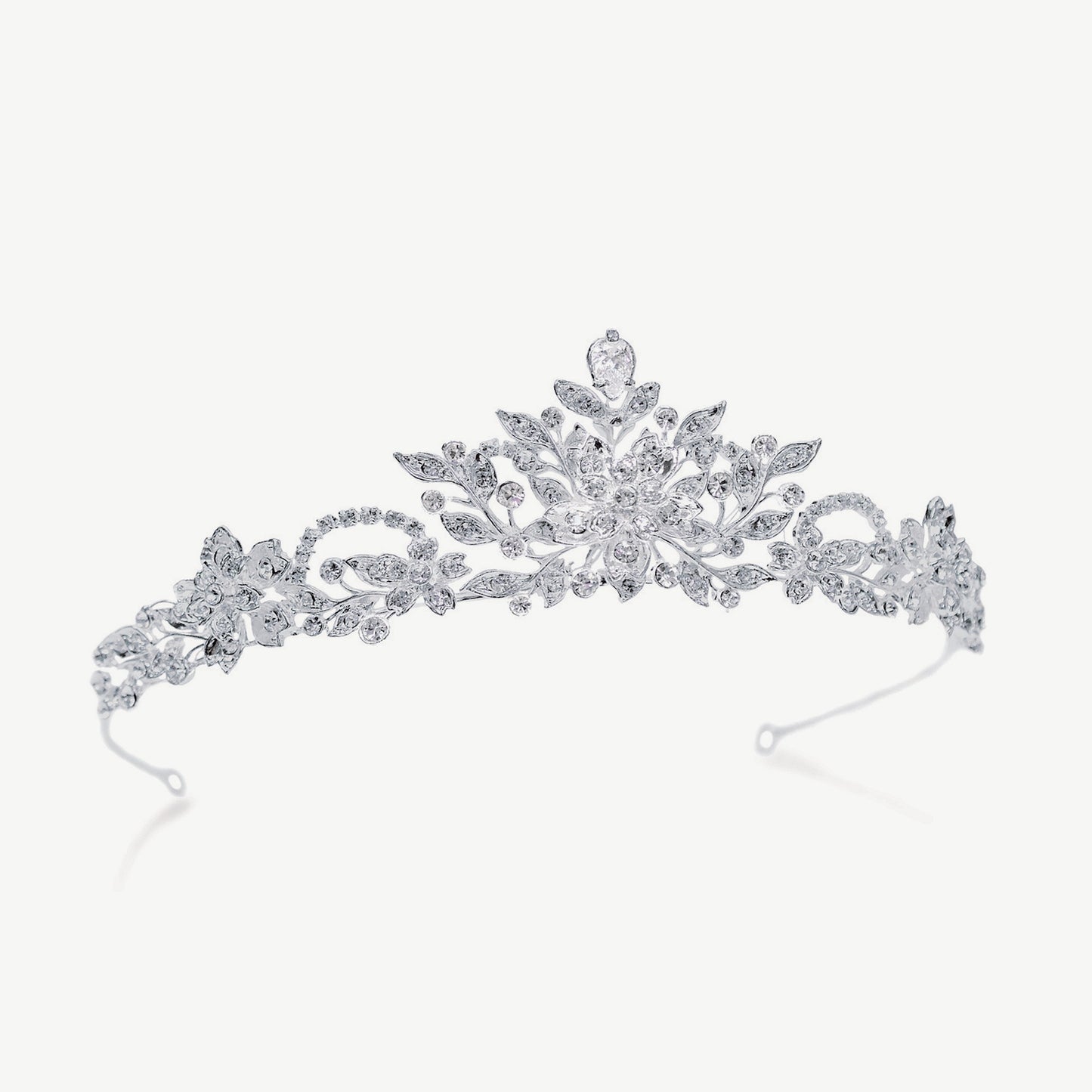 Radiating classic elegance, this tiara is embellished with dazzling Austrian crystals and simulated zirconia diamonds. The refined design showcases delicate floral and leaf vines, topped with an elegant teardrop crystal, embodying romance and grace. Ideal for summer weddings or brides seeking a floral or fairytale-inspired accessory, it adds a gentle shimmer that elevates any bridal ensemble with poise and allure. Designed to suit both traditional and contemporary tastes, this exquisite piece completes your special day with timeless beauty.