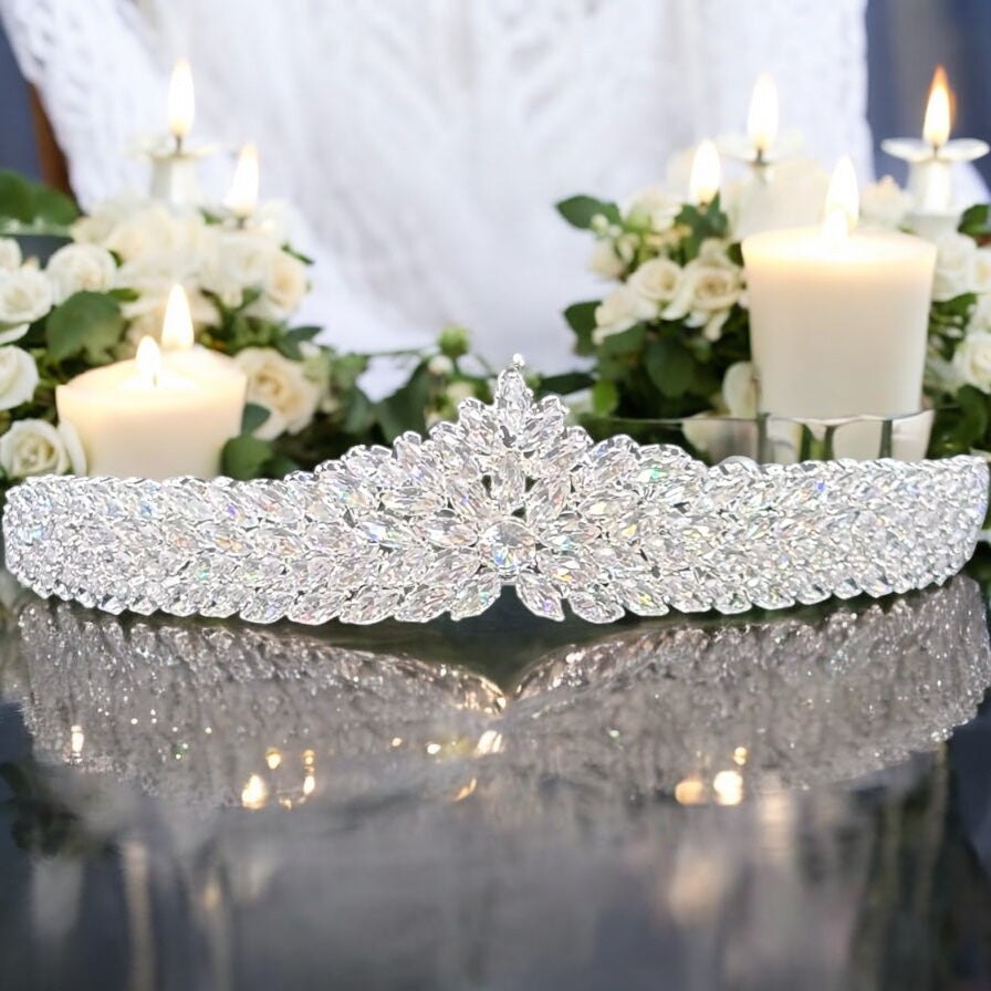 The tiara features a regal, symmetrical design that evokes the elegance of royalty, with a bold central crest that rises gracefully. Its high-shine finish and brilliant light reflection make it the perfect statement piece for a magical walk down the aisle.