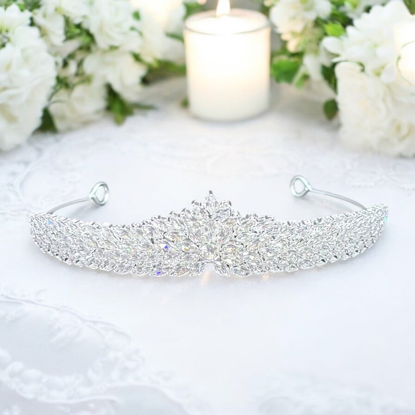 Whether paired with a flowing veil or worn solo, this tiara is a crown fit for a princess, adding the ultimate touch of glamour and enchantment to your bridal look.