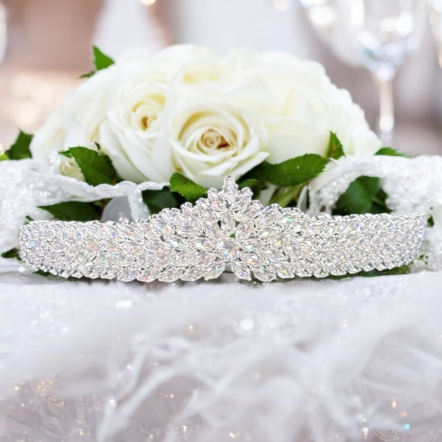 Make your entrance unforgettable with this breathtaking bridal crystal tiara, designed for the bride who dreams of a fairytale wedding. This dazzling headpiece is adorned with hundreds of meticulously arranged crystals that shimmer with every movement, creating an intenseĀ sparkling effect that radiates pure bling.