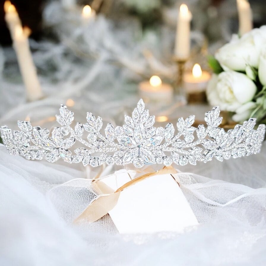 Delicate and dazzling, this dainty crystal wedding tiara is a dream accessory for any bridal look. Its refined silhouette features a graceful arrangement of cut crystals in a leafy, floral motif that evokes natural elegance and ethereal charm. The openwork design gives it a light, airy feel while still offering plenty of sparkling brilliance.