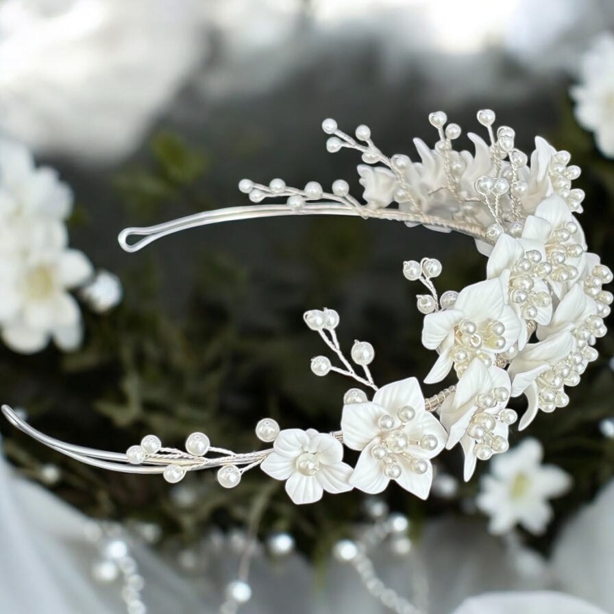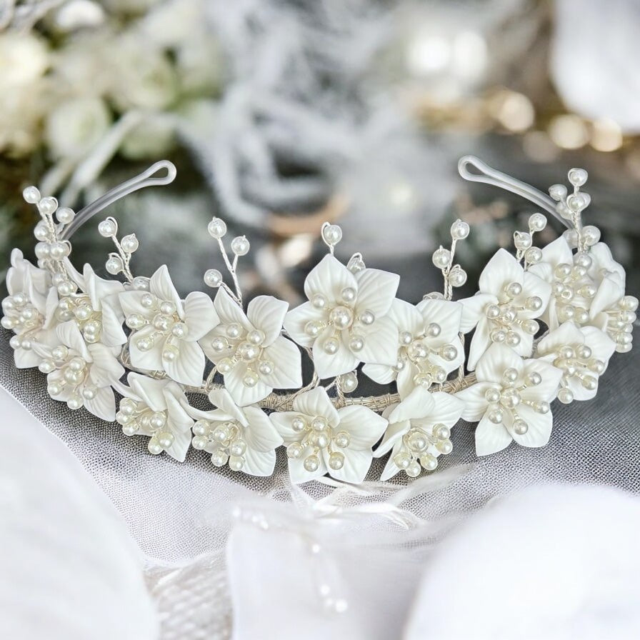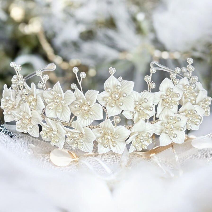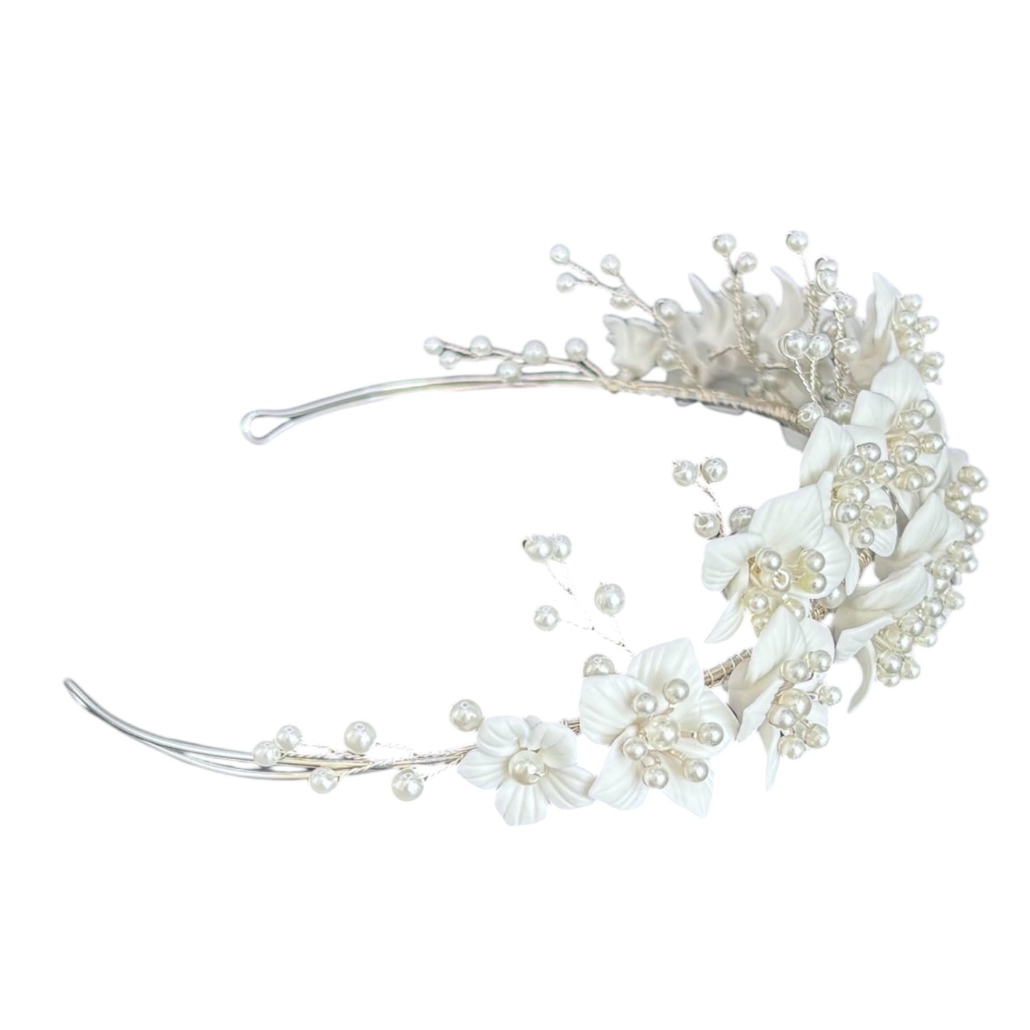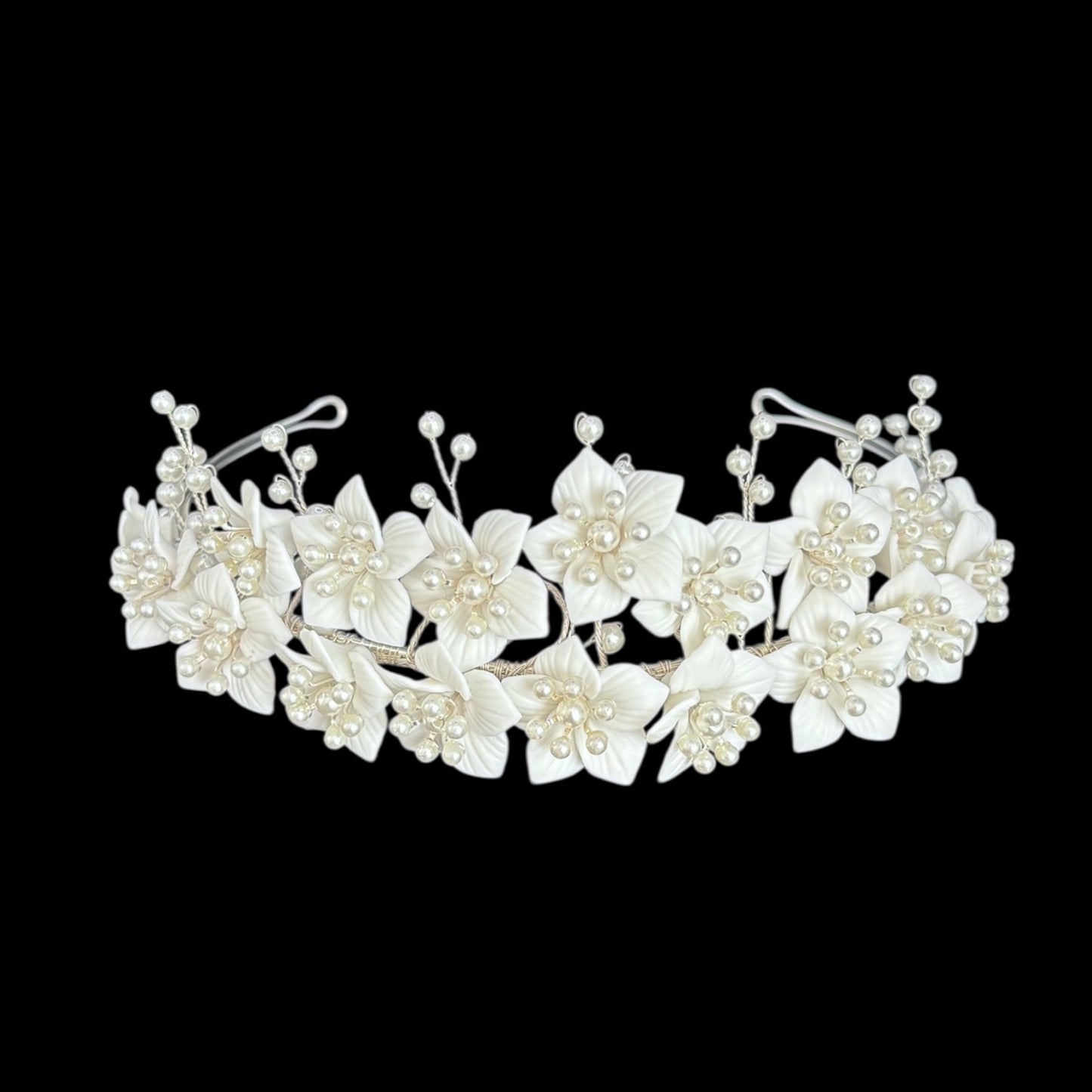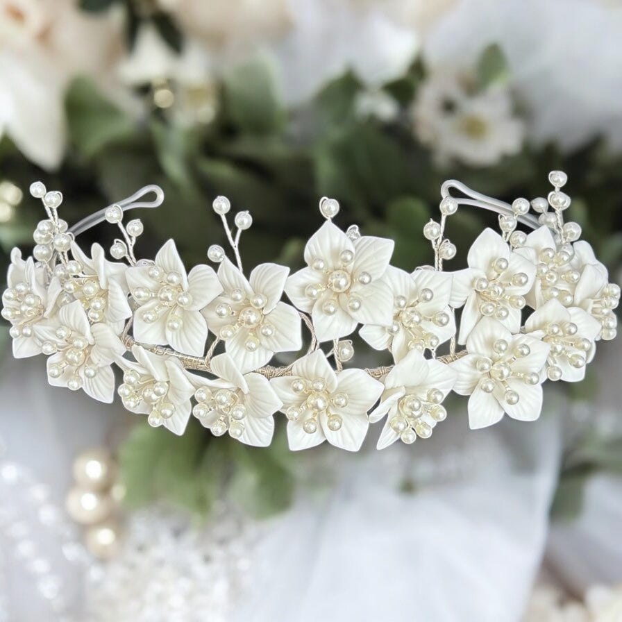 This exquisite bridal headpiece, adorned with a delicate floral pattern and shimmering pearls, embodies the enchantment of nature and romance. Its graceful design adds a touch of femininity to both classic and modern bridal looks, making it perfect for weddings of any season. Lightweight and elegant, this headpiece effortlessly enhances any hairstyle and adds a subtle sparkle to the overall look. Its organic design and subtle shine make it the ideal accessory for brides seeking a soft, ethereal glow with a hint of regal charm. Perfect for garden ceremonies, enchanted forest themes, or any bride dreaming of a wedding filled with wonder and grace, this headpiece is the perfect finishing touch.