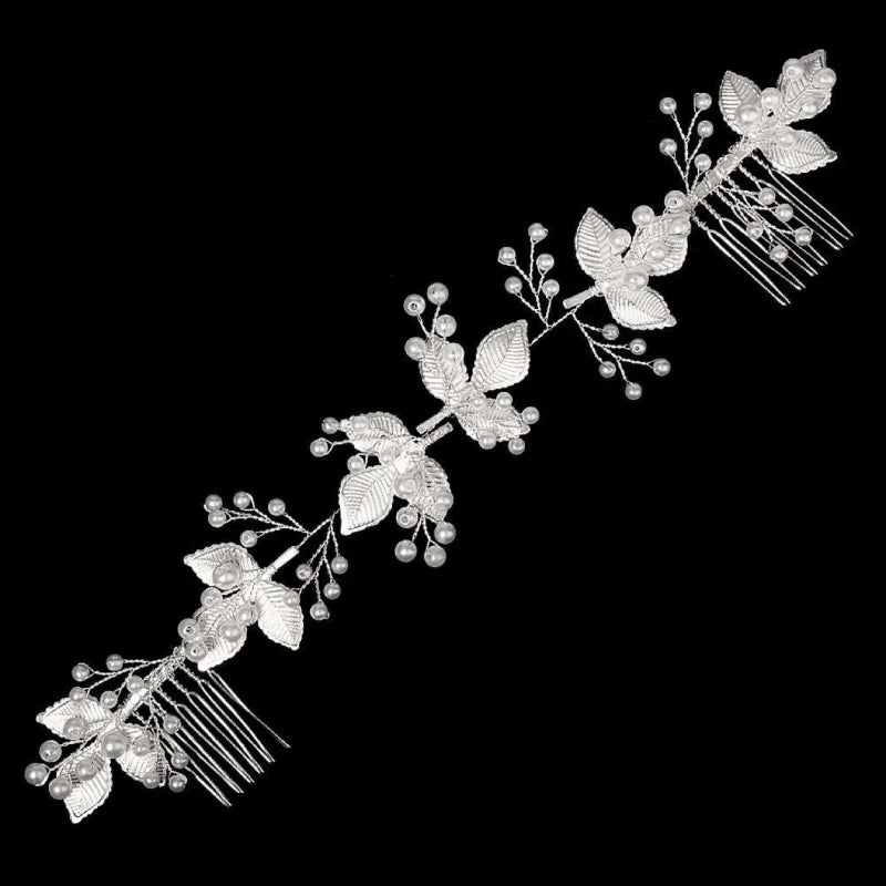 Evoke the spellbinding beauty with the ethereal femininity of this breathtaking wedding hair vine. Intricately crafted and rich with delicate metallic silver leaves and simulated ivory pearls, a headpiece which is sure to delight. The delicate gold leaves and shimmering pearls evoke the beauty of a true princess fit for a fairytale wedding. The pretty hair vine is suitable for both brides and bridesmaids.